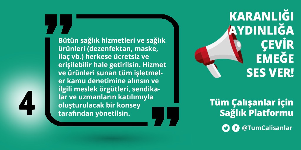 *Bütün sağlık hizmetleri ve sağlık ürünleri (dezenfektan, maske, ilaç vb.) herkese ücretsiz ve erişilebilir hale getirilsin. Hizmet ve ürünleri sunan tüm işletmeler kamu denetimine alınsın ve ilgili meslek örgütleri, sendikalar ve uzmanların katılımıyla oluşturulacak bir konsey tarafından yönetilsin.