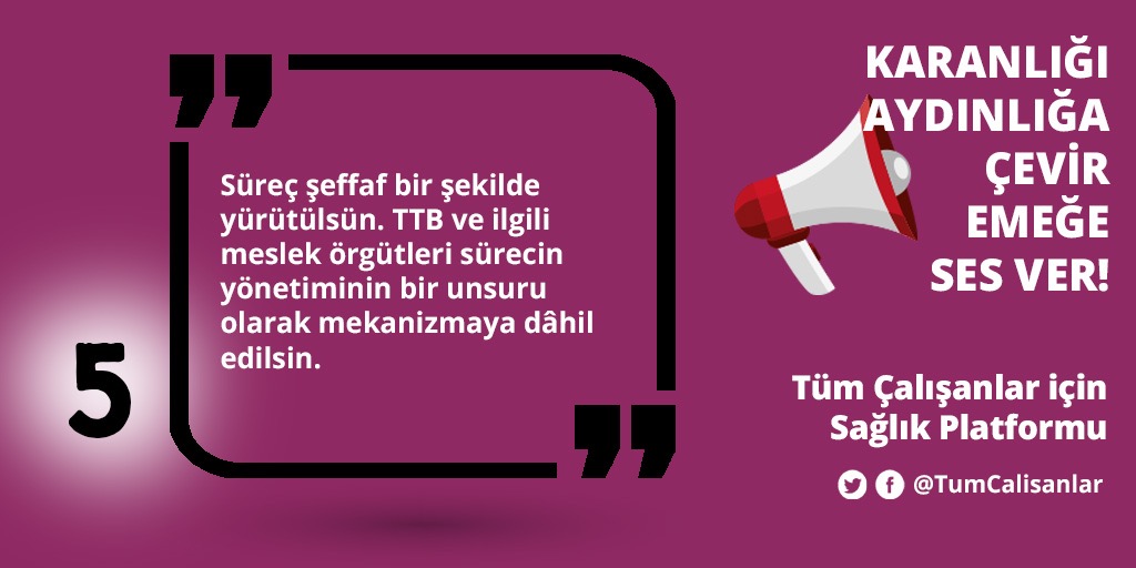 *Süreç şeffaf bir şekilde yürütülsün. TTB ve ilgili meslek örgütleri sürecin yönetiminin bir unsuru olarak mekanizmaya dâhil edilsin.