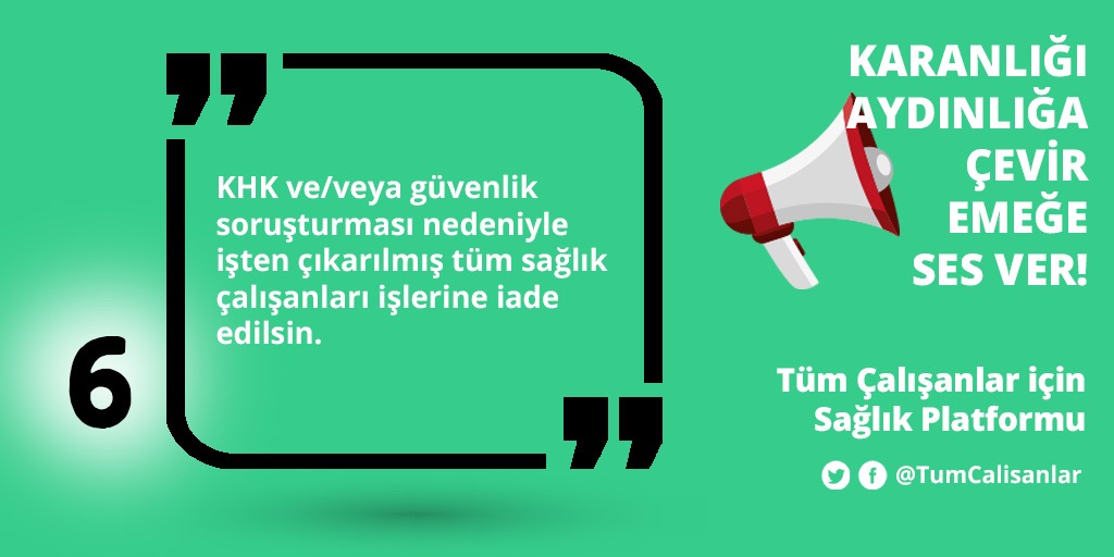 *KHK ve/veya güvenlik soruşturması nedeniyle işten çıkarılmış tüm sağlık çalışanları işlerine iade edilsin.