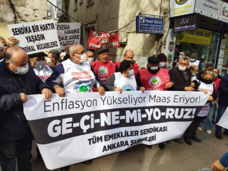 Tüm Emekliler Sendikası, 2022 bütçesine yönelik Ankara’da sokağa çıkarak basın açıklaması yaptı. “Savaşa, yandaşa değil, emekliye, emekçiye bütçe” diyen sendika üyeleri “Enflasyon yükseldi maaş eridi, geçinemiyoruz” pankartı açarak taleplerini sıraladı.