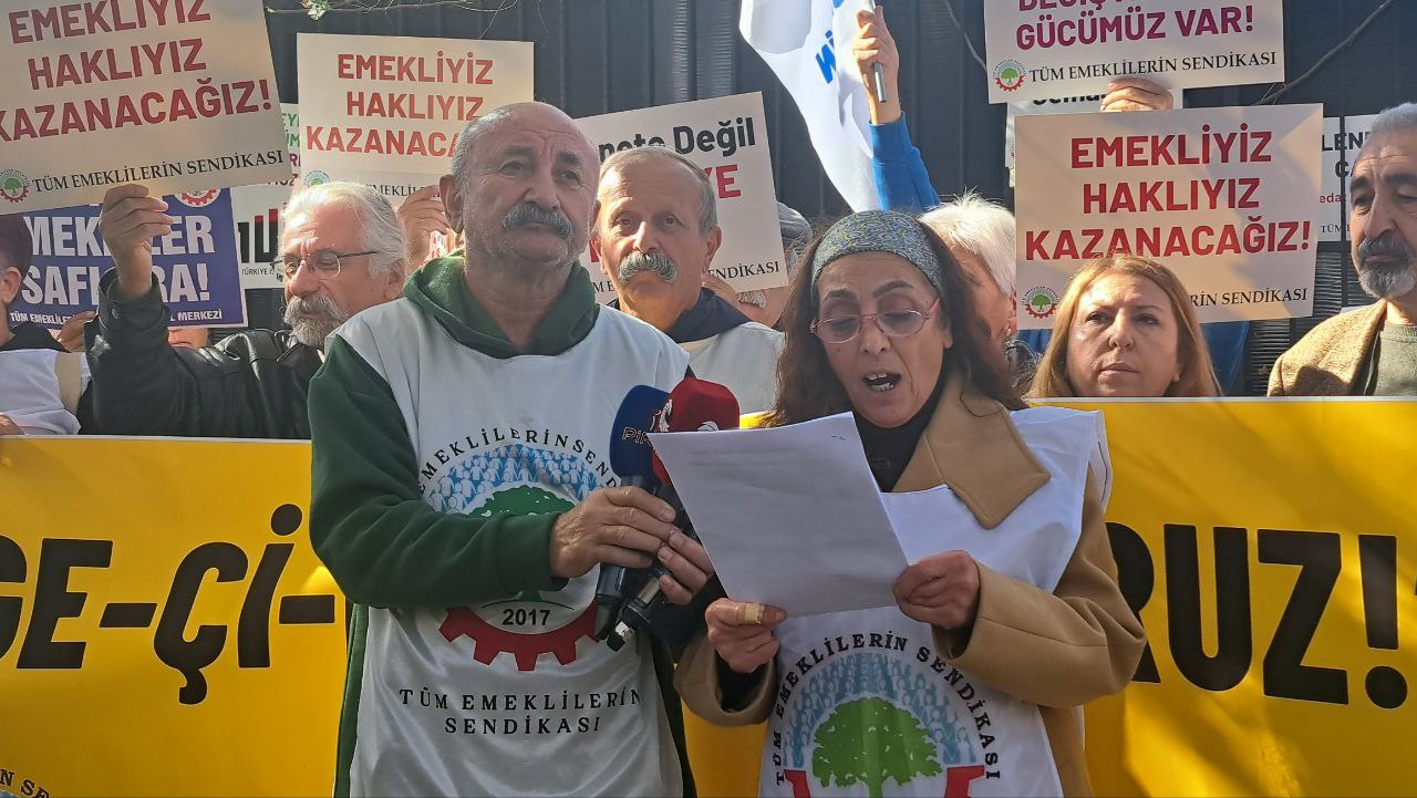 Tüm Emekliler Sendikası, TELE 1’e kayyım atanması ve SGK Başkanı Raci Kaya’nın emeklilere yönelik “Eskiden 50-55 yaşında ölüyorduk, şimdi emekliler 78 yaş ortalamasına geldi” açıklamasına tepki gösterdi. Basın açıklamasını sendika adına Keçiören Şube Başkanı Zerrin İğleyen, TÜİK Genel Müdürlüğü önünde yaptı.