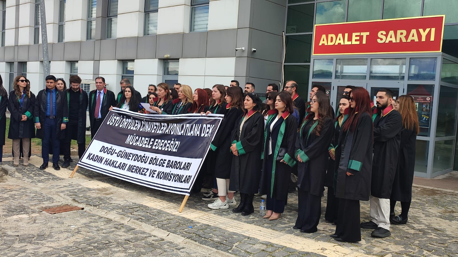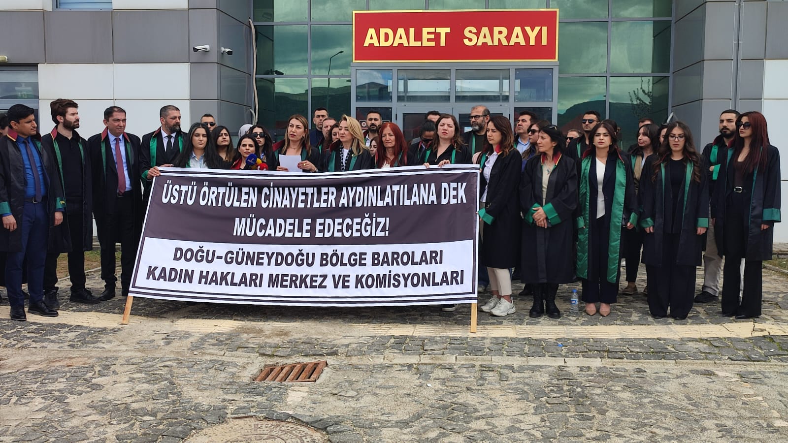 Bölge Baroları Kadın Hakları Merkez ve Komisyonları, Dersim’de 5 Ocak 2020’de kaybettirilen daha sonra katledildiği ortaya çıkan Munzur Üniversitesi Çocuk Gelişimi 2’nci sınıf öğrencisi Gülistan Doku için adliye önünde açıklama gerçekleştiriyor. Açıklamaya Türkiye Barolar Birliği (TBB) Başkan Yardımcısı Bahar Candemir ile çok sayıda avukat katıldı. Açıklamada, “Üstü örtülen cinayetler aydınlatılana dek mücadele edeceğiz” pankartı açıldı.