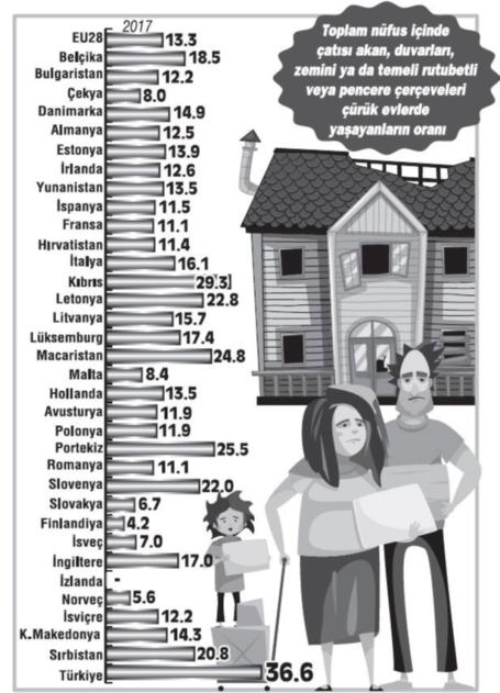 Türkiye, yoksulluk, yaşam kalitesi, istihdam gibi konularda bir çok Avrupa ülkesinin gerisinde bulunuyor. Eurostat’a göre, Türkiye’de nüfusun yüzde 36.6’sı yoksulluk nedeniyle çatısı akan, duvarları, zemini ya da temeli rutubetli veya pencere çerçeveleri çürük evlerde yaşıyor.