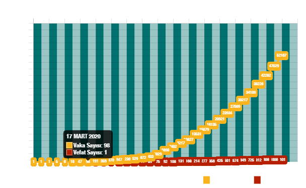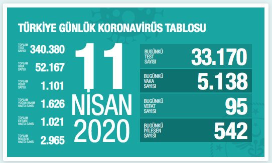 Tabloya göre, toplam test sayısı 340 bin 380, toplam vaka sayısı 52 bin 167, toplam vefat sayısı 1101, toplam yoğun bakım hasta sayısı bin 626, toplam entübe hasta sayısı bin 21, toplam iyileşen hasta sayısı 2 bin 965 oldu.