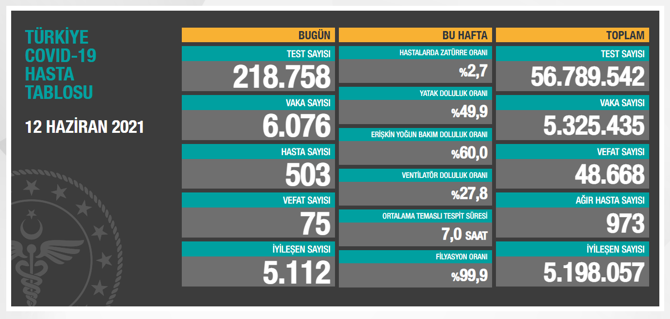 Sağlık Bakanlığı, koronavirüs (Kovid-19) günlük hasta tablosunu paylaştı. Verilere göre, Türkiye’de koronavirüs nedeniyle son 24 saatte 75 kişi daha hayatını kaybetti, 503 yeni hasta dahil olmak üzere 6 bin 076 yeni vaka tespit edildi.