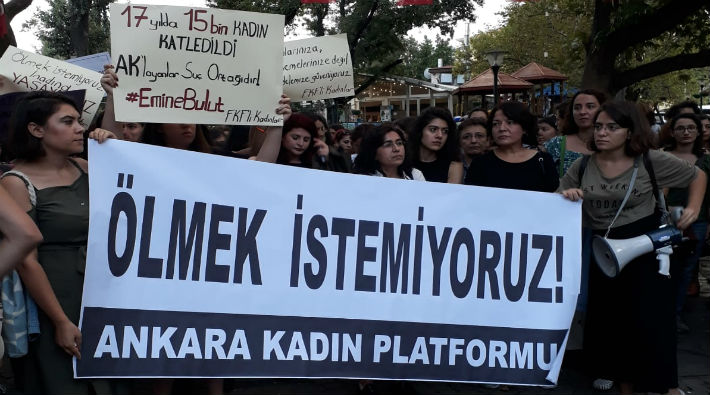 “Öfkeliyiz, kızgınız, üzgünüz. Emine’nin ölümüne neden olanları bildiğimiz için ama en çok. Kadınların şiddete uğradığı, cinayetlerin hiç hız kesmediği bu ülkede, kadınlara ısrarla ‘boşanmayacaksınız’ denildiği için öldürüldü. Dünyanın en normal şeylerinden biri olan boşanmak bu ülkede aile üzerinden inşa edilen politikalar nedeniyle adeta suçmuş gibi konuşuluyor. Boşanan kadınları sapkın hayatlar yaşamakla suçlayan, boşanmaları ne pahasına engellemek için Meclis’te komisyonlar kuran, aileleri parçalatmayacağız diye dört bir yerden açıklamalar yaptıran, nafakayı kaldırmak için yasa hazırlıkları yapan, şiddete ilişkin koruma kararları almamızı sağlayan 6284 sayılı yasayı kaldırmak isteyen, İstanbul Sözleşmesi’nden devletin imzasını çekmesi için uğraşan siyasal iktidar Emine Bulut’un ölümünün sorumlusudur.