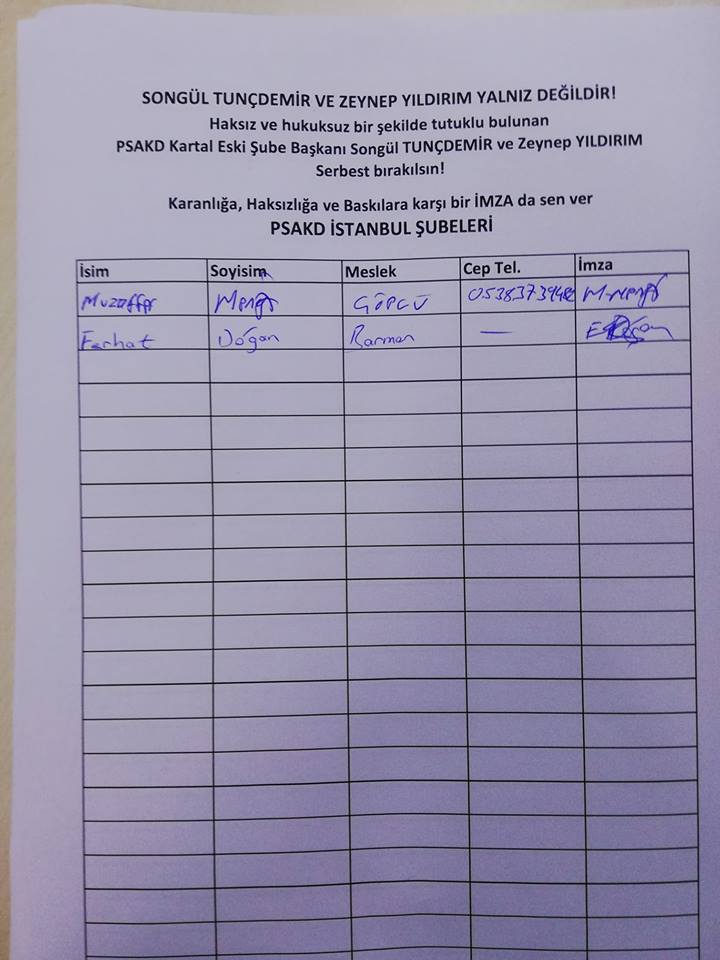 ‘Songül Tunçdemir ve Zeynep Yıldırım yalnız değildir’ sloganıyla başlatılan imza kampanyasında Tunçdemir ve Yıldırımın haksız yere tutuklandığı ve biran önce serbest bırakılmaları istendi.