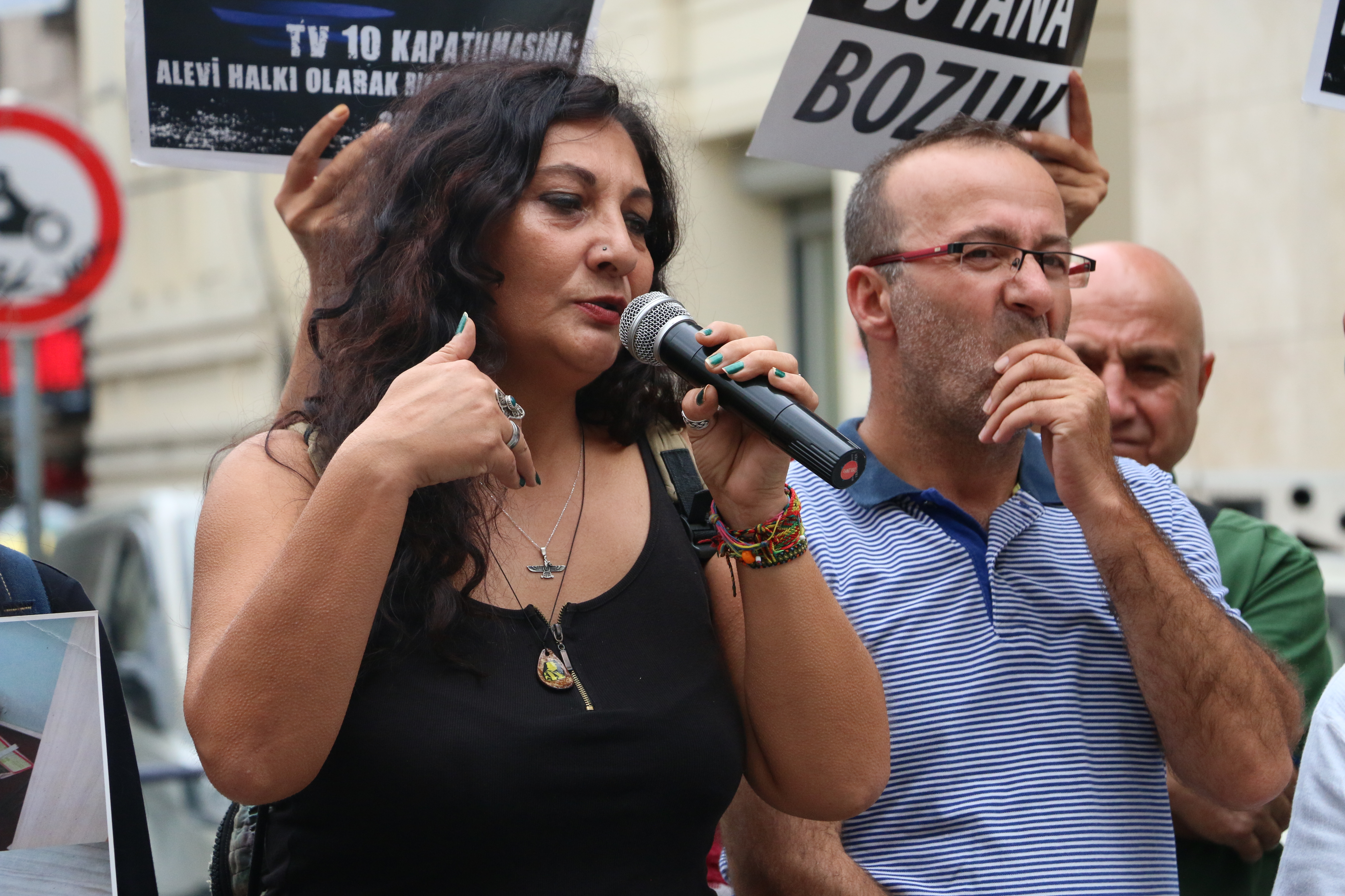Büyükşahin’den sonra konuşan Radyo Dünya emekçisi Mine Kaynak, “Yaklaşık bir yıldır KHK gerekçe gösterilerek 15 yıldır emek yediğim ve kendi emeğimiz ile kurduğumuz Radyo Dünya’yı sabaha karşı gelip mühürleyerek ve kapattılar. Ve bütün teknik malzememize el koydular. Bizle birlikte o süreçte birçok basın yayın organı bu bahane ile kapatılıp ve el konuldu. Bu yapılan haksızlıkların ve hukuksuzlukların tek bir nedeni var. Bizlerin özgür ve tarafsız yayın yapmasıdır. Bu iktidar özgür ve tarafsız basını yıldırmaya çalışıyor. Ancak bizler yılmayacağız ve susmayacağız” dedi.