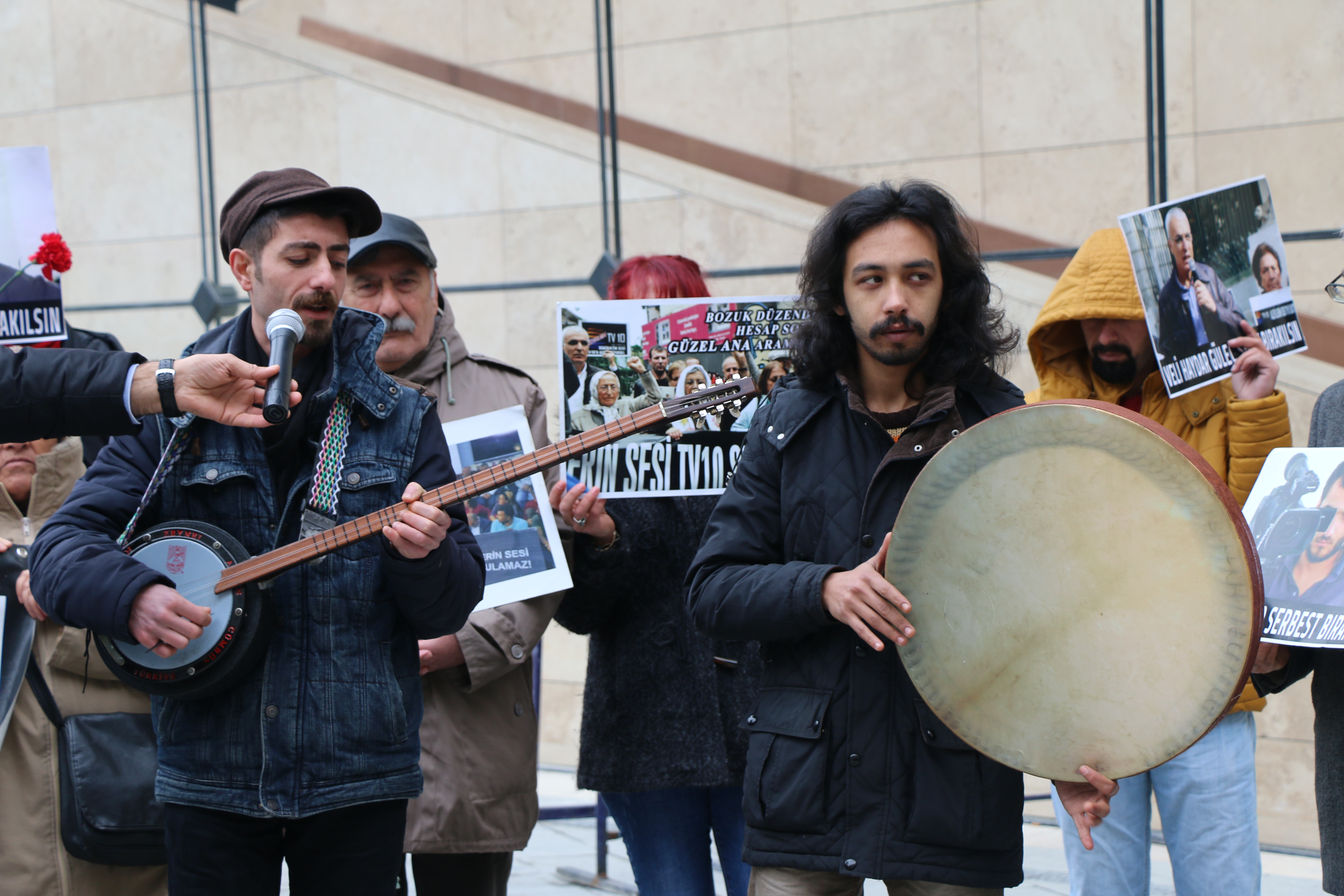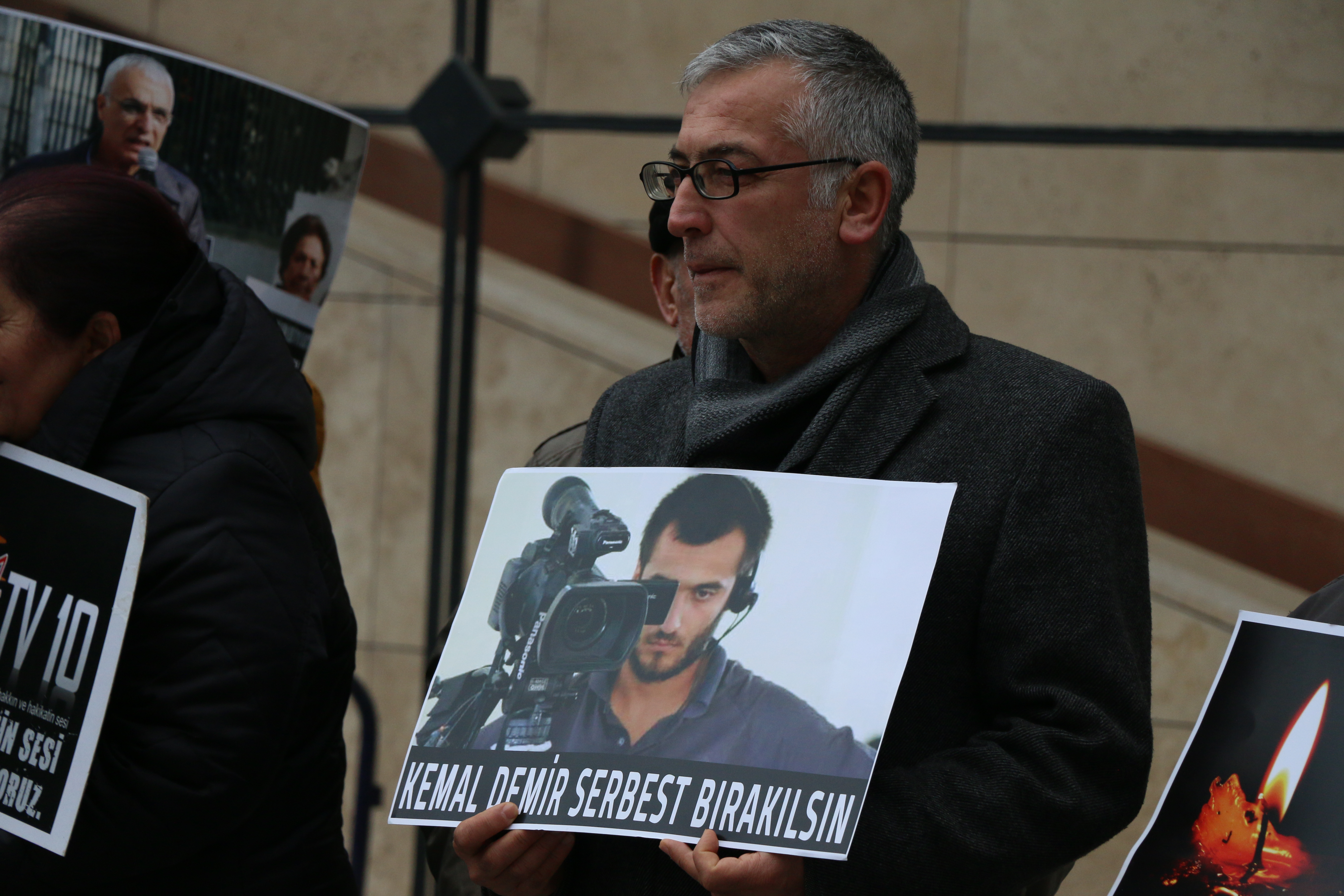 Eylemde konuşan KHK ile kapatılan TV10 Haber Müdürü Turabi Kişin, tutuklanan TV10 çalışanlarının durumuna dikkat çekti. Kişin, “TV10 çalışanlarından tutuklanan Veli Büyükşahin, Veli Haydar Güleç ve Kemal Demir’in iddianameleri hala hazırlanmadı” dedi.