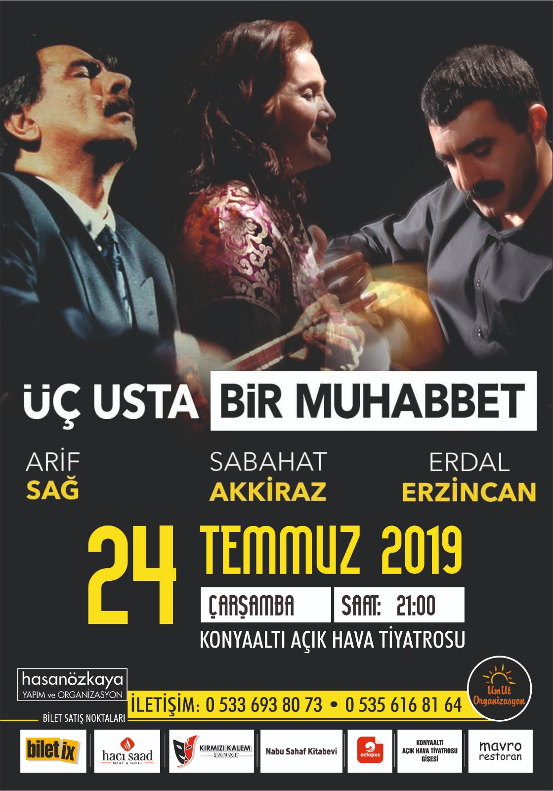 Konserler dizisinde Arif Sağ, Sebahat Akkiraz ve Erdal Erzincan aynı sahnede yeni bir repertuarı dinleyenlerine sunacak. 24 Temmuz Çarşamba günü Konyaaltı Açık Hava Tiyatrosu’nda gerçekleşecek konser saat 21.00’de başlayacak.