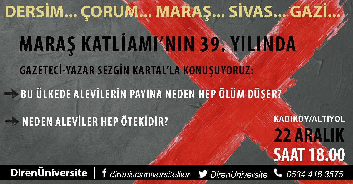 Maraş Katliamı’nın 39. yıl dönümünde İstanbul’daki üniversitelerde okuyan gençler Gazeteci-Yazar Sezgin Kartal ile “Alevilerin payına neden hep ölüm düşer? Neden Aleviler hep ötekidir?” sorularını tartışıyor. Etkinlik, 22 Aralık Cuma günü İstanbul Kadıköy Altıyol’da saat:18.00’de gerçekleşecek.