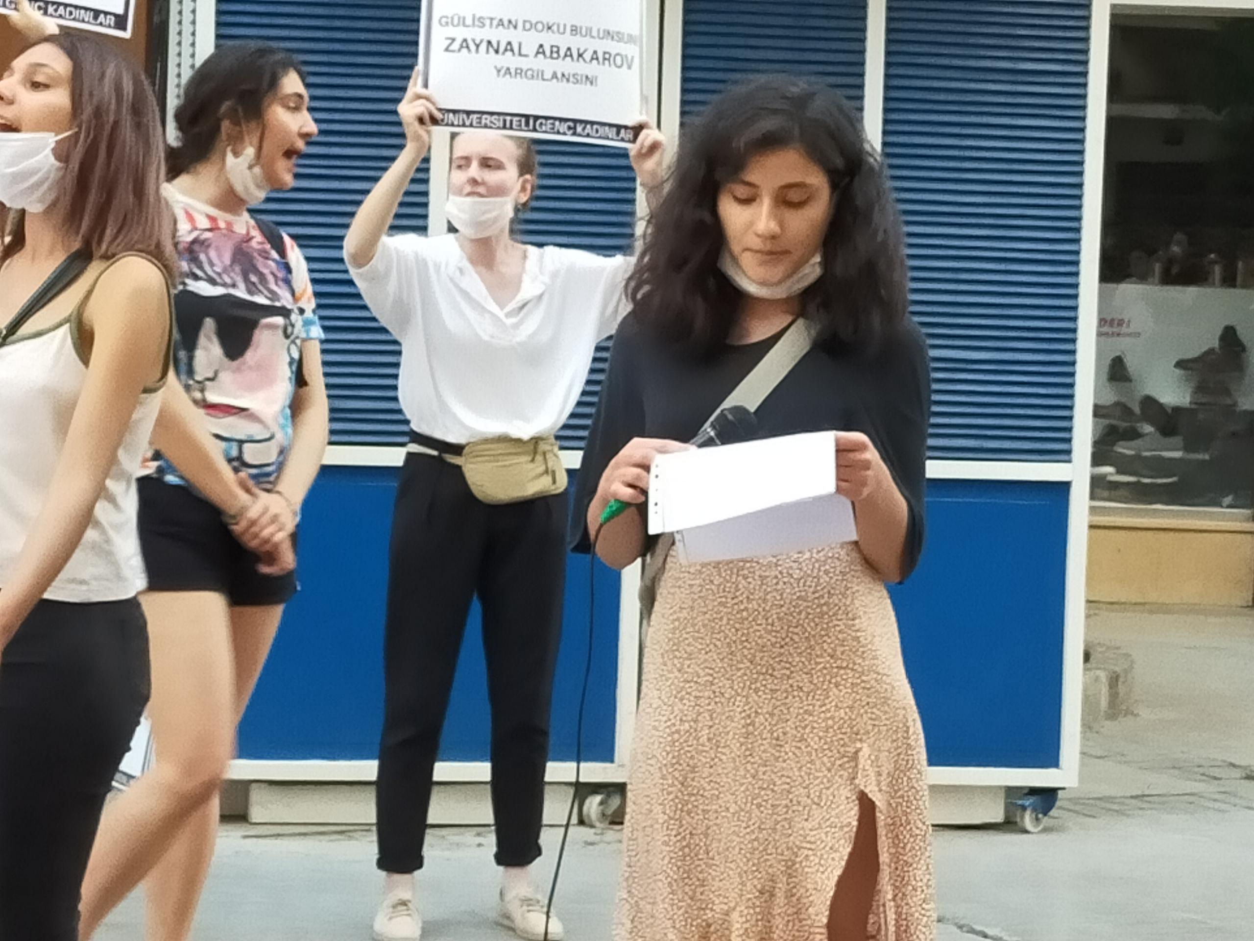 “Gülistan Doku bulunsun Zaynal Abakarov yargılansın” pankartının taşındığı açıklamada “Zaynal Abakarov yargılansın” “Bir kişi daha eksilmeyeceğiz”, “Susmuyoruz korkmuyoruz, itaat etmiyoruz” sloganları atıldı.