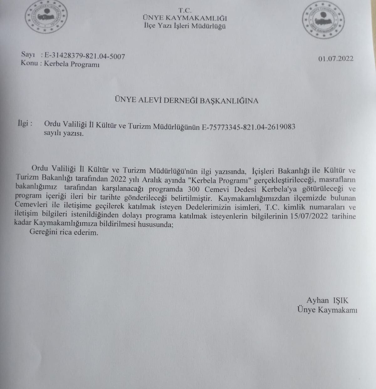 “Kaymakamlığımızdan ilçemizde bulunan cemevleriyle iletişime geçilerek katılmak isteyen dedelerimizin isimlerini, TC. numaralarını ve iletişim bilgilerini 15.07.2022 tarihine kadar kaymakamlığımıza bildirilmesi hususunda gereğinin yapılmasını rica ederim.”