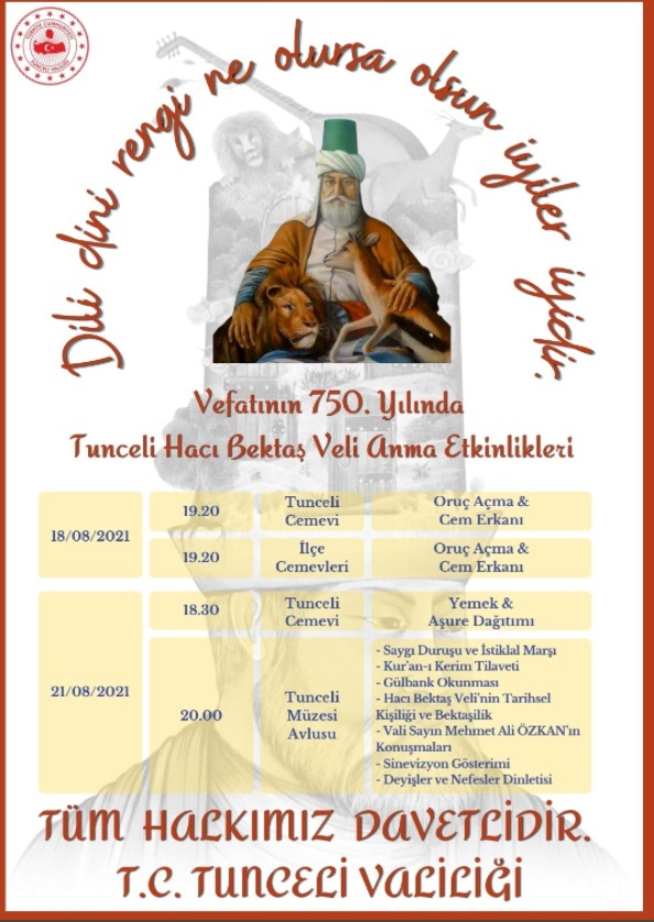 Tunceli Valiliği’nin “Vefatının 750. Yılında Tunceli Hacı Bektaş Veli anma etkinlikleri” şeklinde duyurduğu programa göre, bu akşam Tunceli Cemevi ve ilçe cemevlerinde oruç açma ve cem erkânı düzenlenecek.