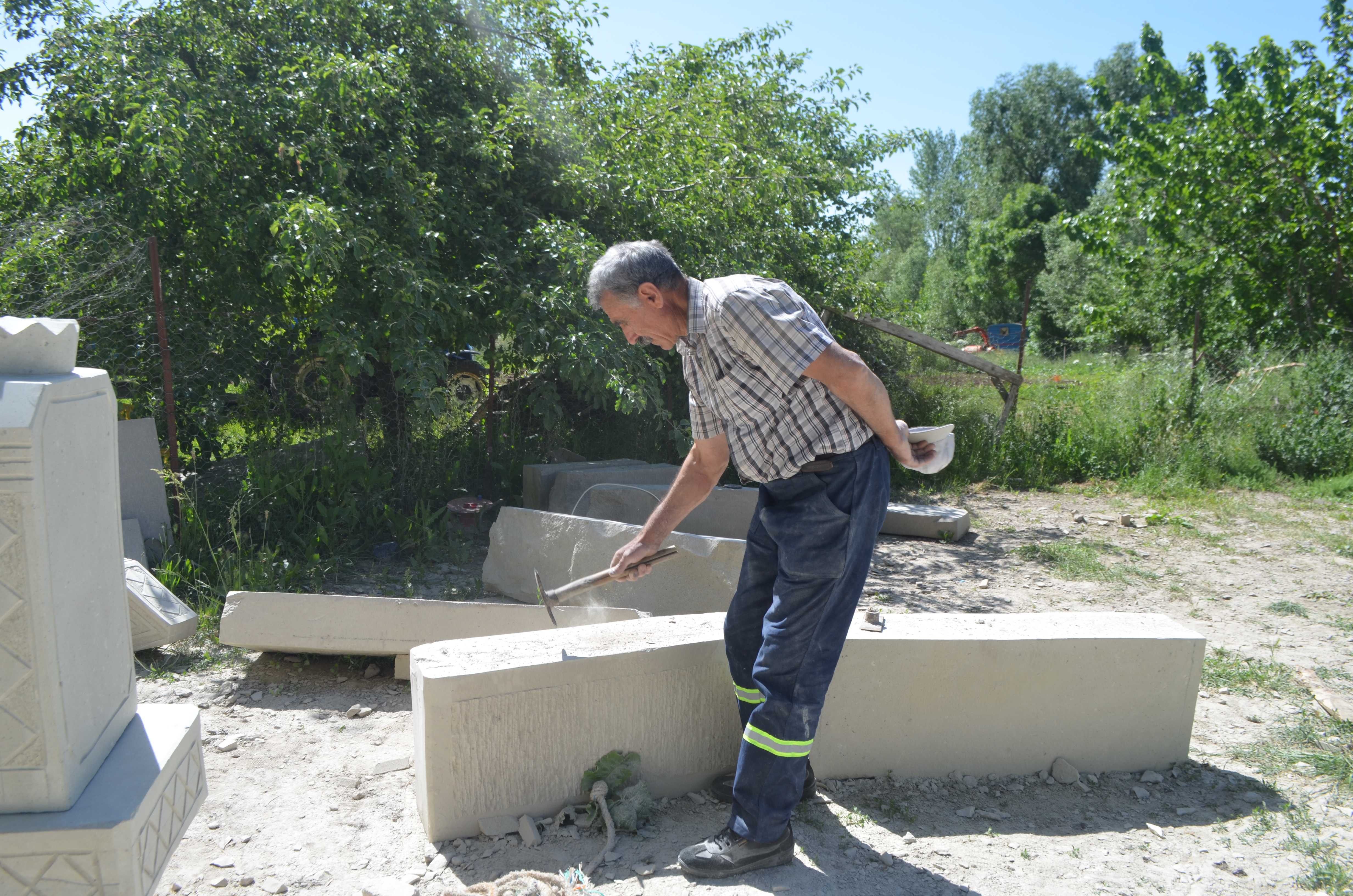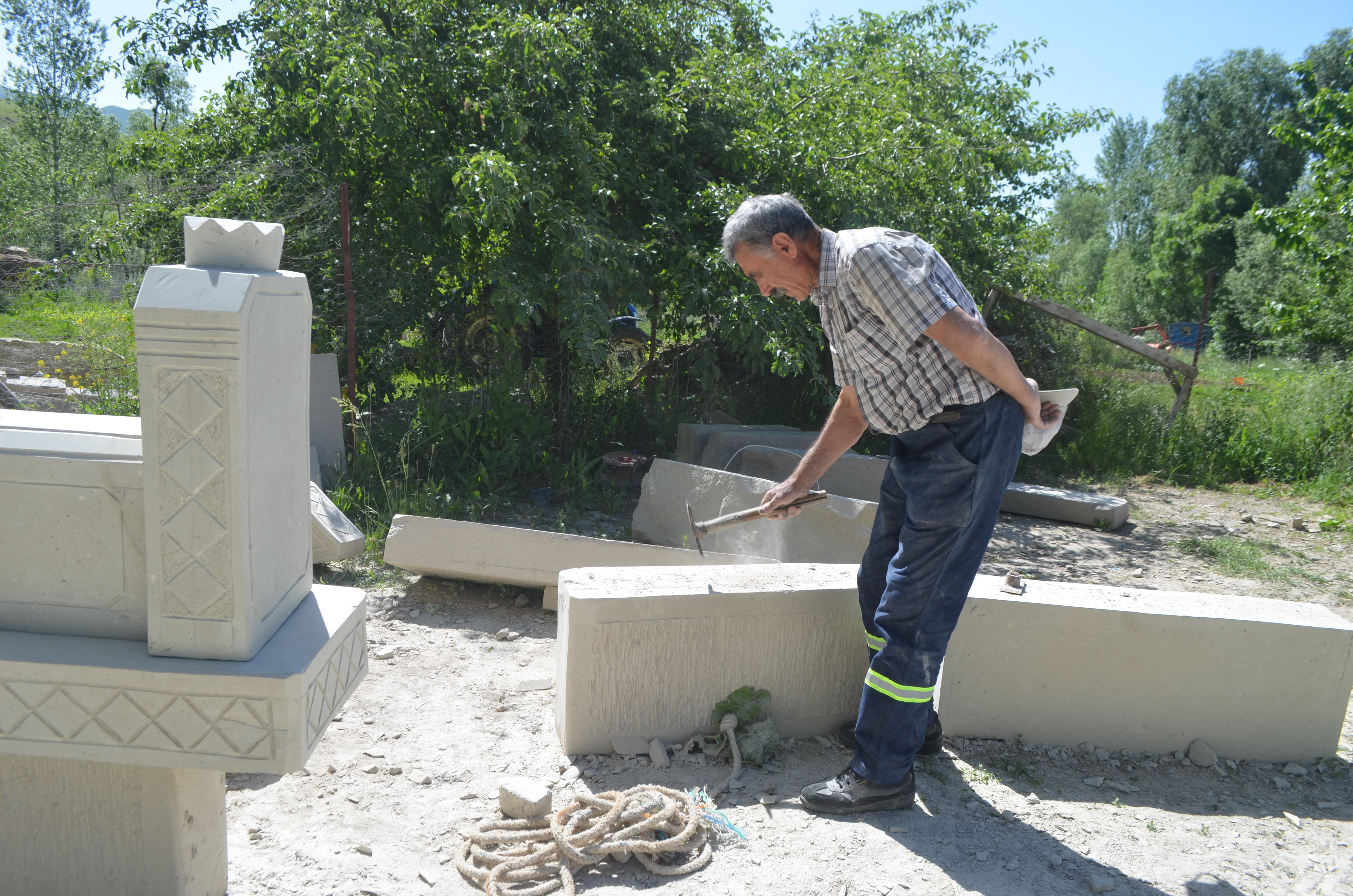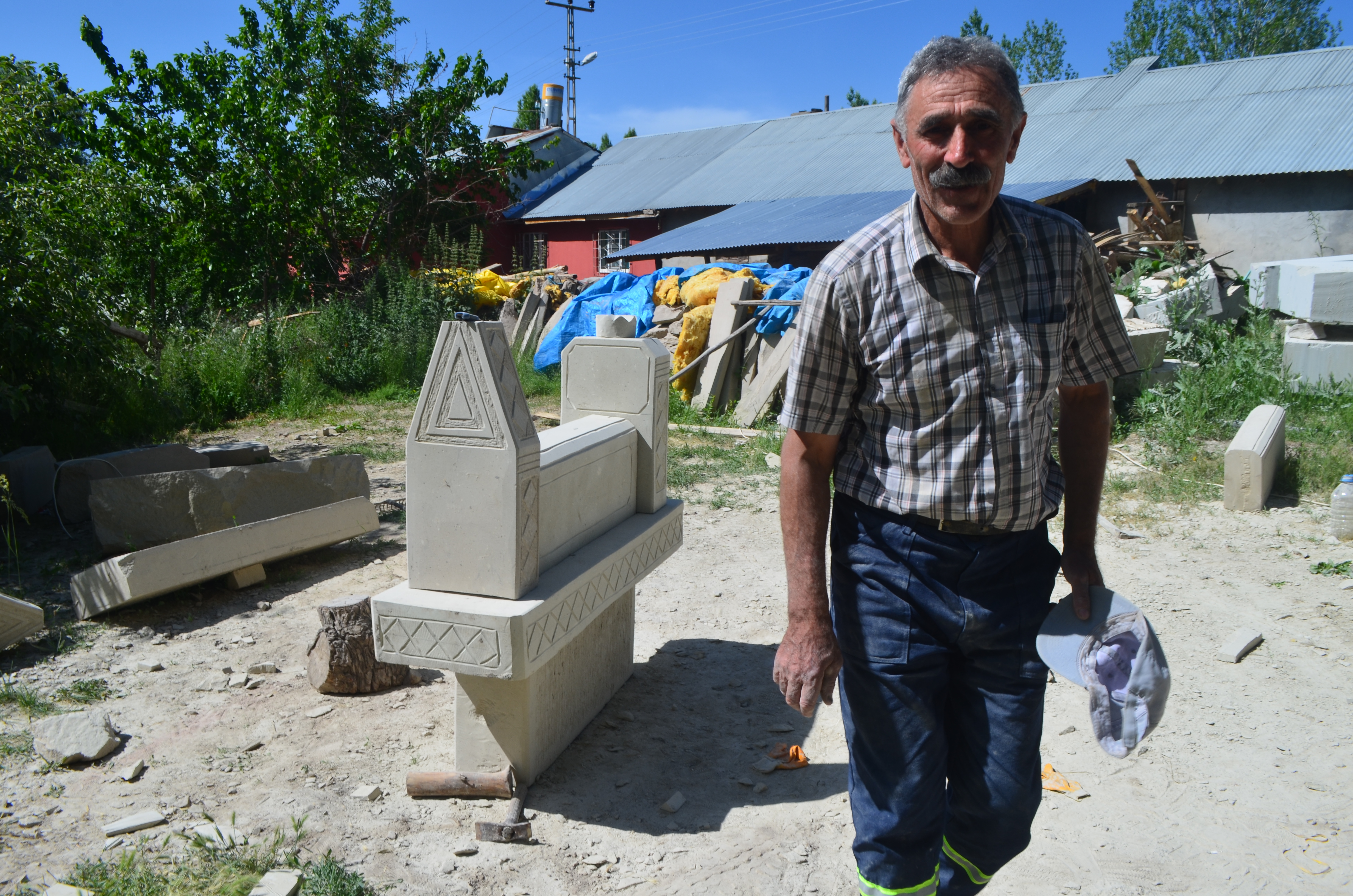 “Sert taşlar işimi zorlaştırıyor tabii ki. Taşların bir kısmını Elazığ’dan bir kısmını Bingöl Karlıova’dan bir kısmını da Erzurum Hınıs’tan getiriyoruz. Köydeki tek mezar ustasıyım. Çırağım yok. Bundan sonra da bu köyde mezar işini yapacak bir insan olacağını tahmin etmiyorum. Kaza yapmaya çok meyilli bir iş, bazen müşterilerinin istediği şekilde olmayabiliyor. En iyi şekilde de yapmış olsam eleştiriler alıyorum tabii ki. Geçimimi bu meslekten sağlıyorum arada bir hayvancılıkla uğraşsam da hayvancılık sezonluk bir iş olduğundan asıl meslek olarak mezarcılık yapıyorum.”
