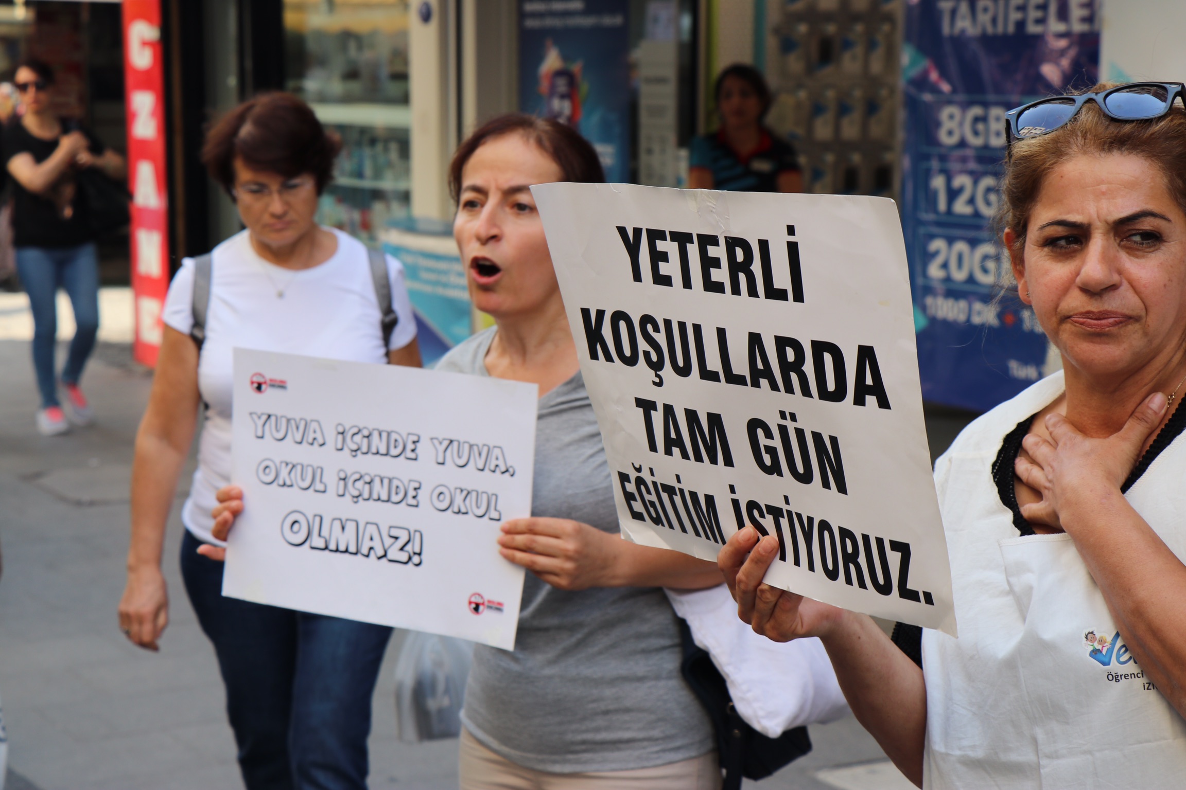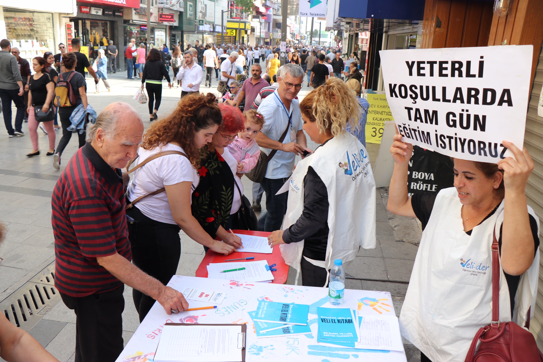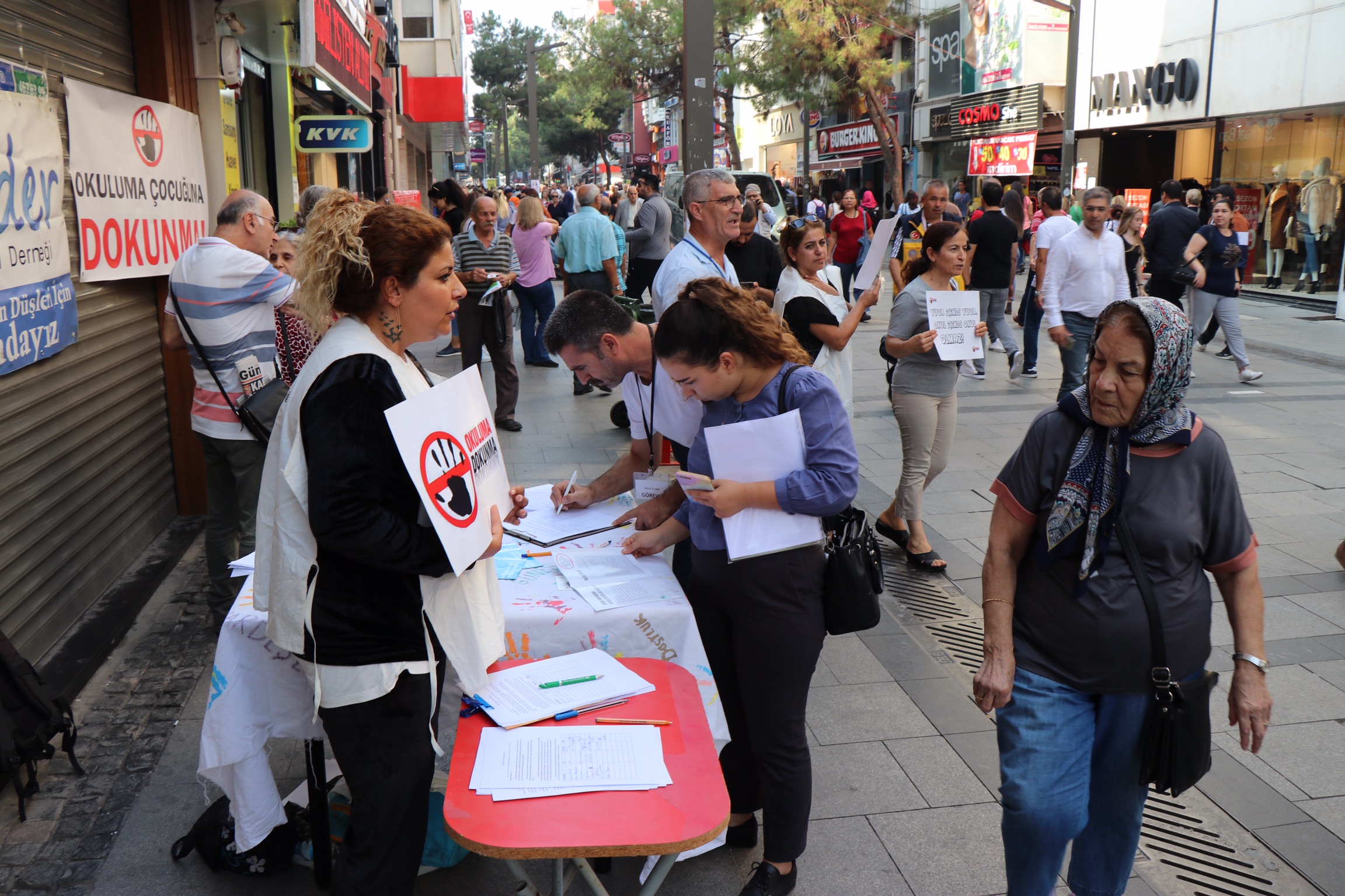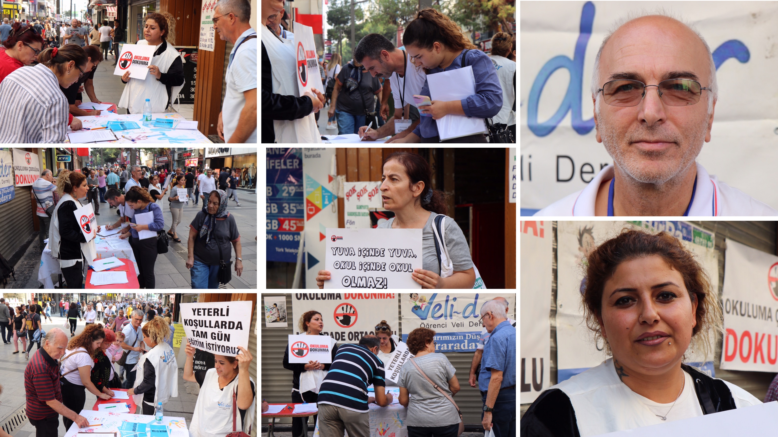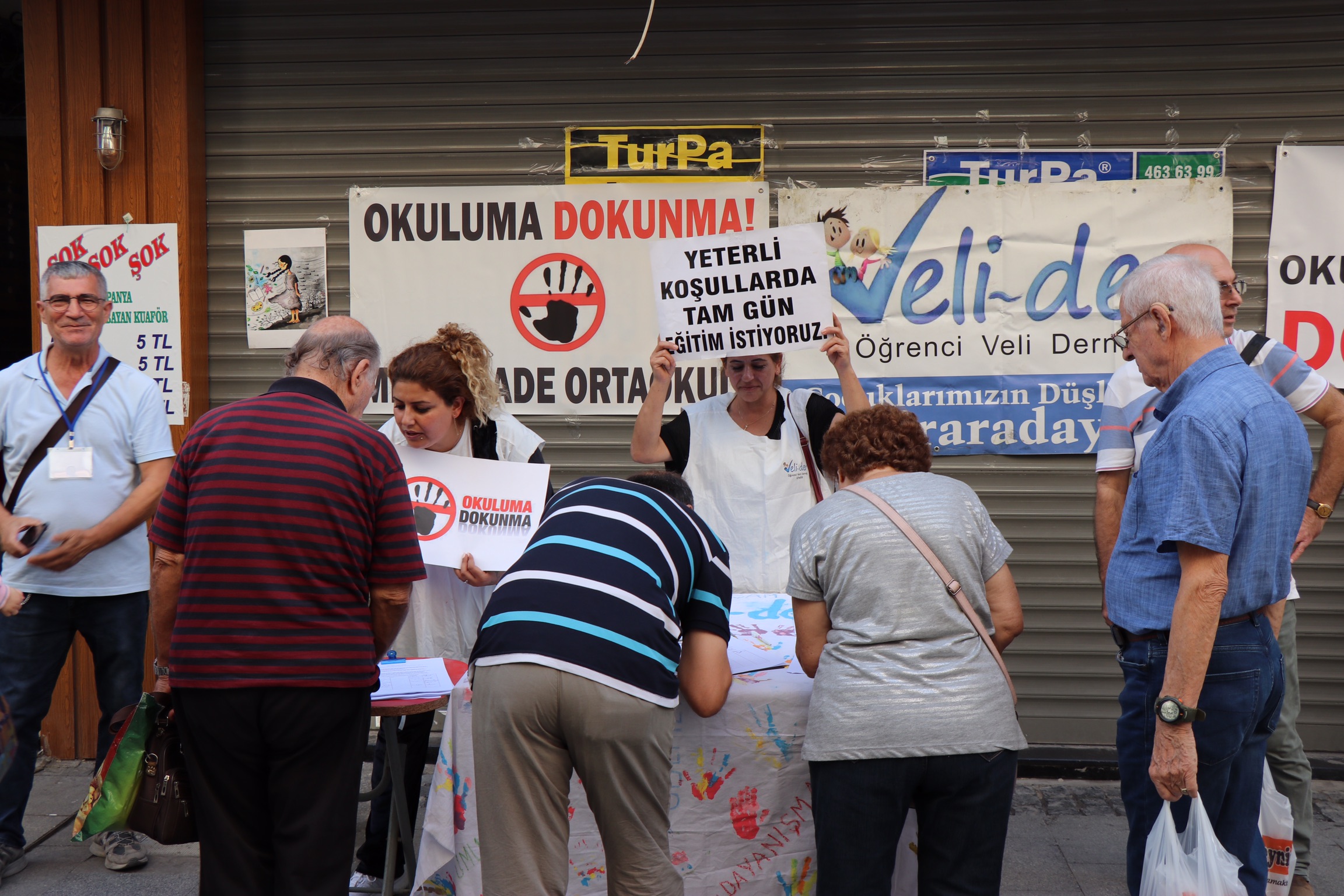 “Okuluma dokunma”, “Yeterli koşullarda tam gün eğitim istiyoruz”, ve “Yuva içinde yuva, okul içinde okul olmaz” dövizlerinin taşındığı imza kampanyası standında veliler yaşadıkları sorunlara dair yurttaşları bilgilendirdi.