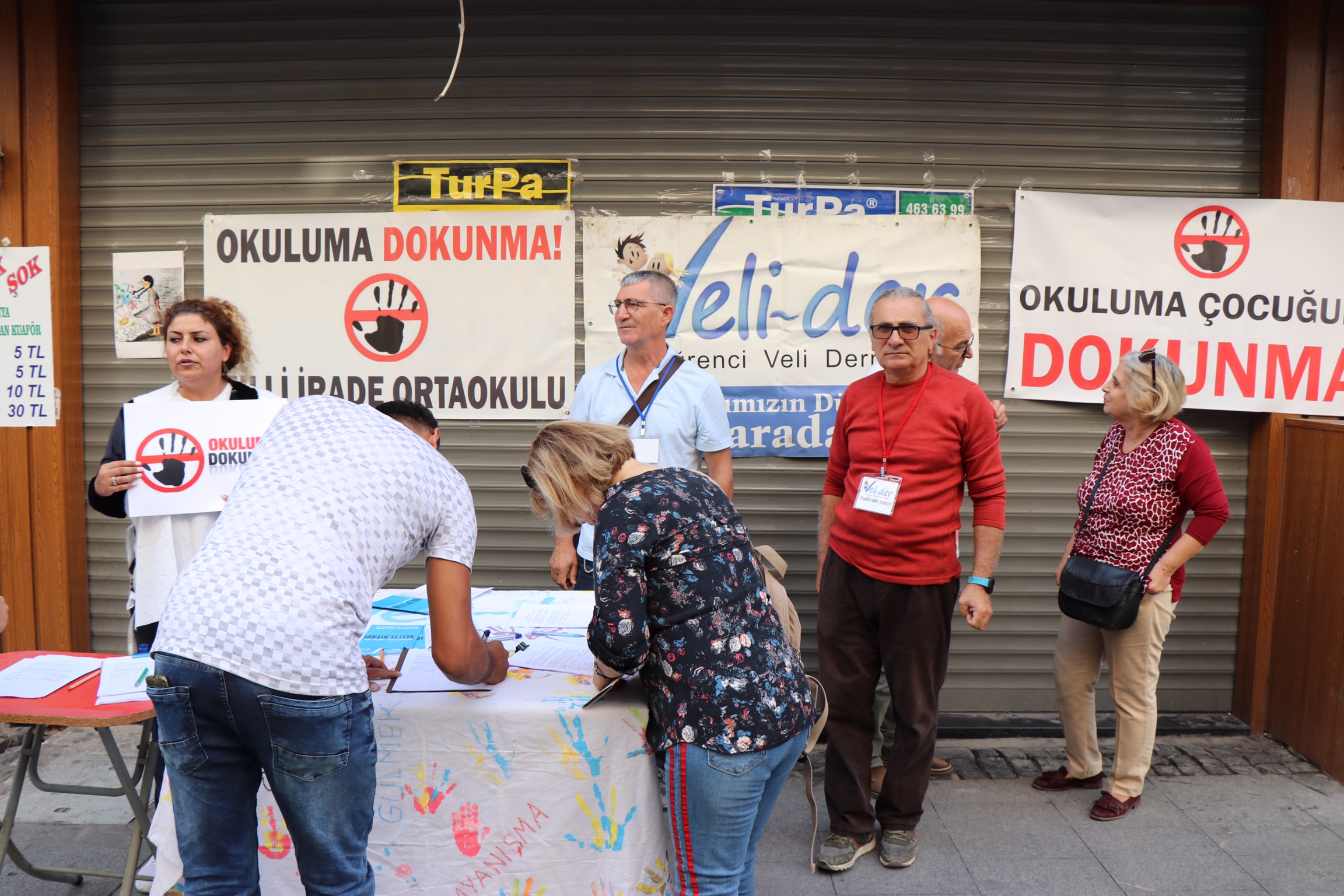 PİRHA- İzmir’in Bayraklı ilçesine bağlı Onur Mahallesi’nde bulunan Milli İrade Ortaokulu kampüsüne imam hatip sınıfları açılmasını protesto eden velilerin başlattığı imza kampanyası 5. gününde Karşıyaka çarşısında devam ediyor. Laik ve bilimsel eğitim istediklerinin altını çizen veliler şu ana kadar 2 binin üzerinde imza topladı.