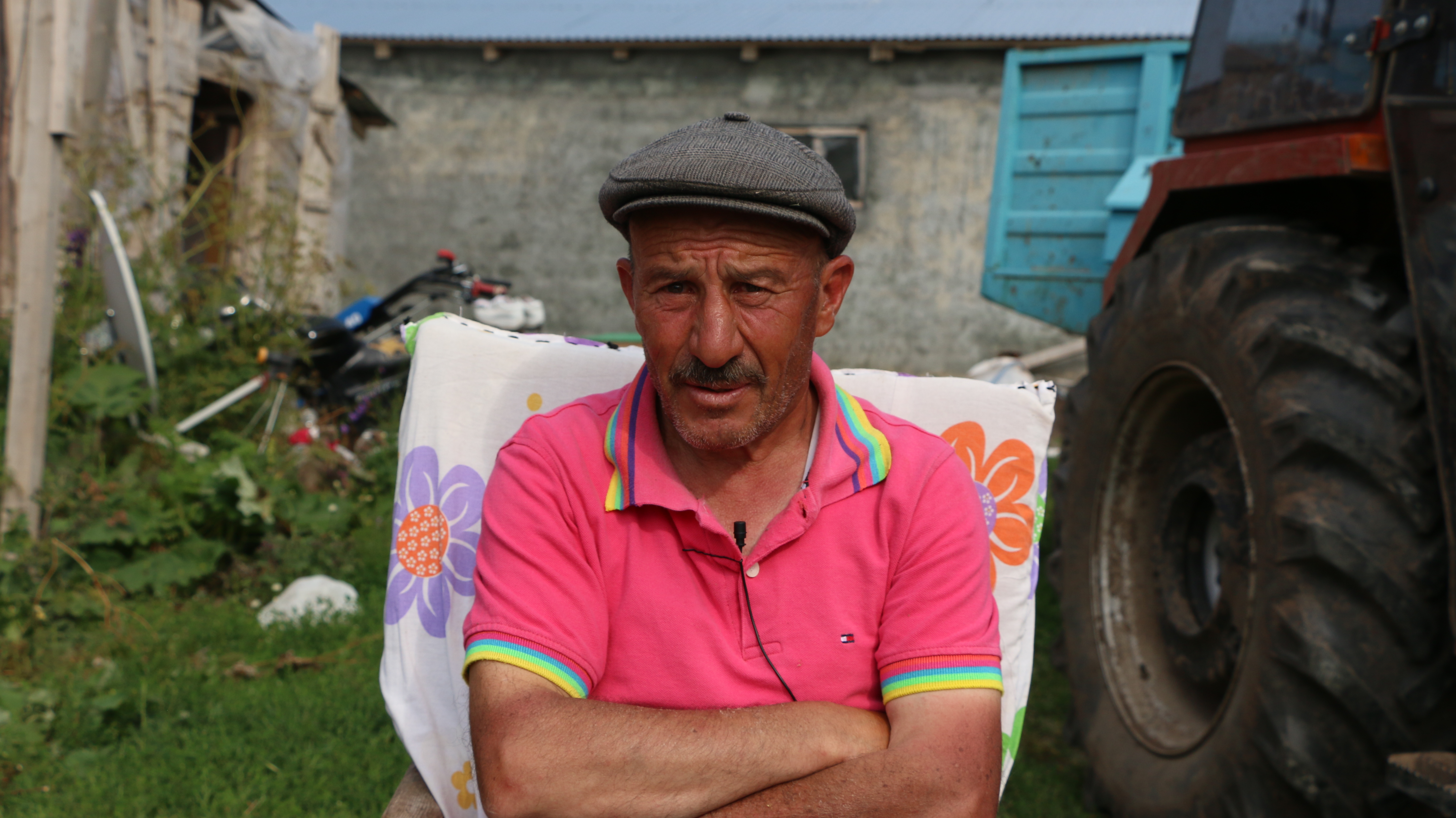 “Beni evimden silah zoruyla çıkardılar. Eşeğime varana kadar çıkardılar. Evdeki eşyalarımı tarumar ettiler. Elimi kelepçeleyip beni attılar arabanın içine. Ailemi de başka bir yere. Üç ay burada çadırda kaldım. Hayvanlarımı zorla çıkardılar içeriden. Evimden hiçbir eşya alamadım. İçeriye giriyorlar hepsini alıyorlar hiç haberim yok ki evimden neyimi aldılar neyimi almadılar. Bana yaptıkları ev de inşaat halinde. Yarım yaptılar. Şimdi inşaatta yatıyorum. Ne boya var, ne sıva var ne de kapı var. Hiçbir şey yok. Hayvanım da bitti. 6 tane hayvanım kaldı 30 hayvan gitti. Koyacak yer yoktu hayvanlarımın çoğunu sattım. Üç tane birine götürdüm, iki tane birine götürdüm dışarıda kaldı hayvanlarım. Körpe danalarım dışarıda kaldı suyun içinde, yağmurun altında. Neler çektim. Ahırımı ve evimin çatısını hayvan satarak kendim yaptım.”