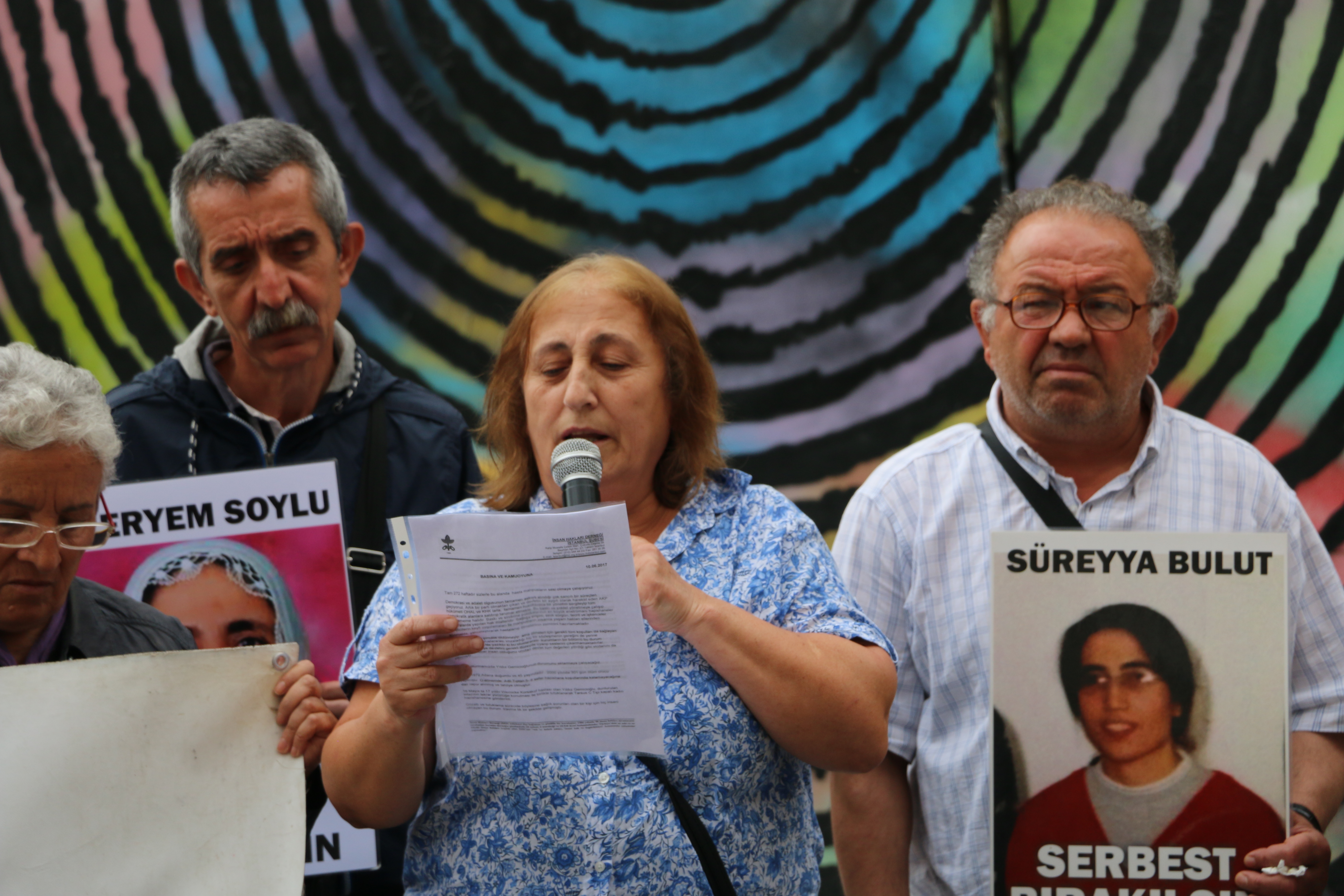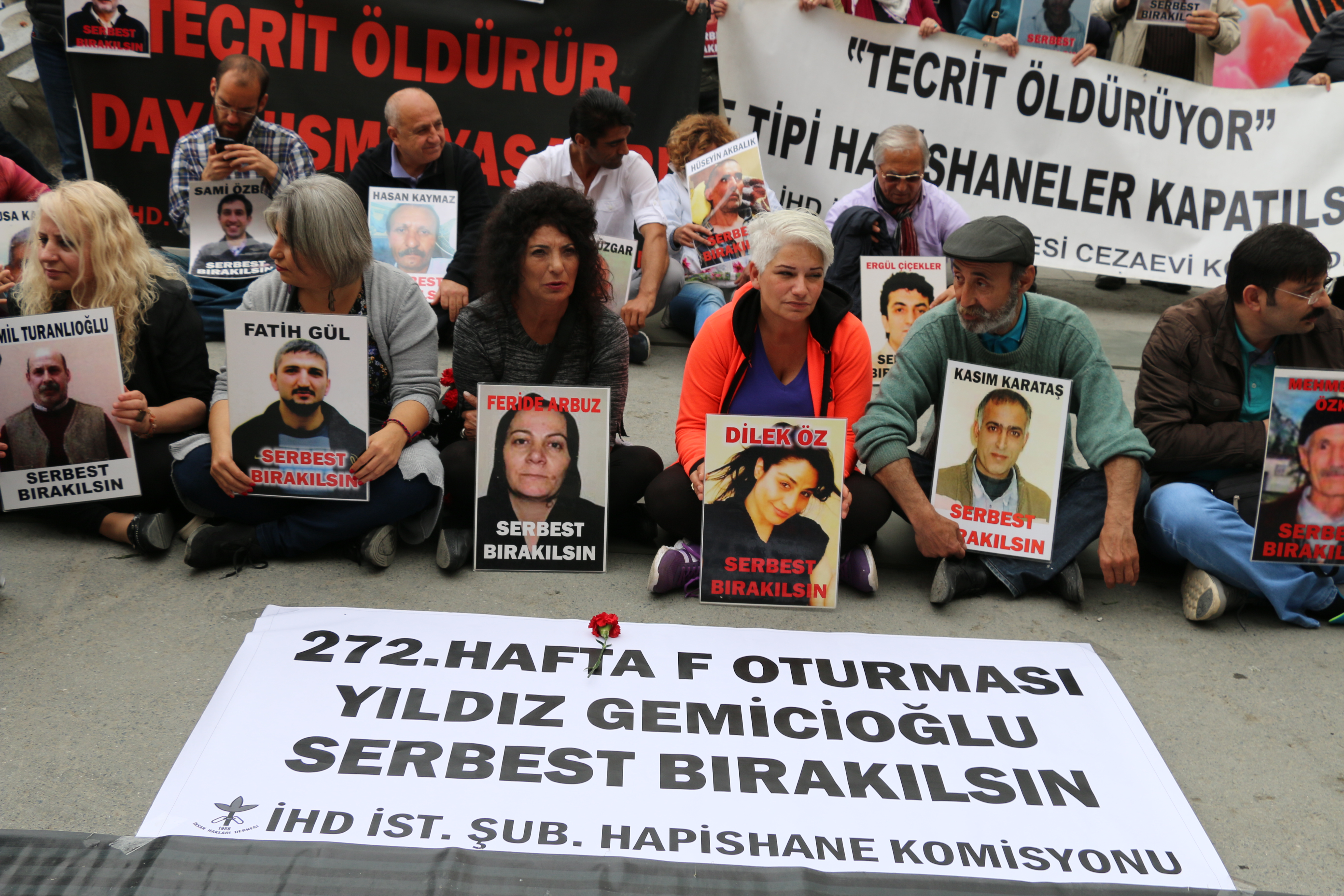 İHD İstanbul Şubesi Hapishane Komisyonu’nun hasta tutukluların durumuna dikkat çekmek amacıyla her hafta Cumartesi günü Galatasaray Meydanı’nda yaptıkları oturma eyleminin 272. haftasında hasta tutuklu Yıldız Gemicioğlu’nun serbest bırakılması talep edildi.
