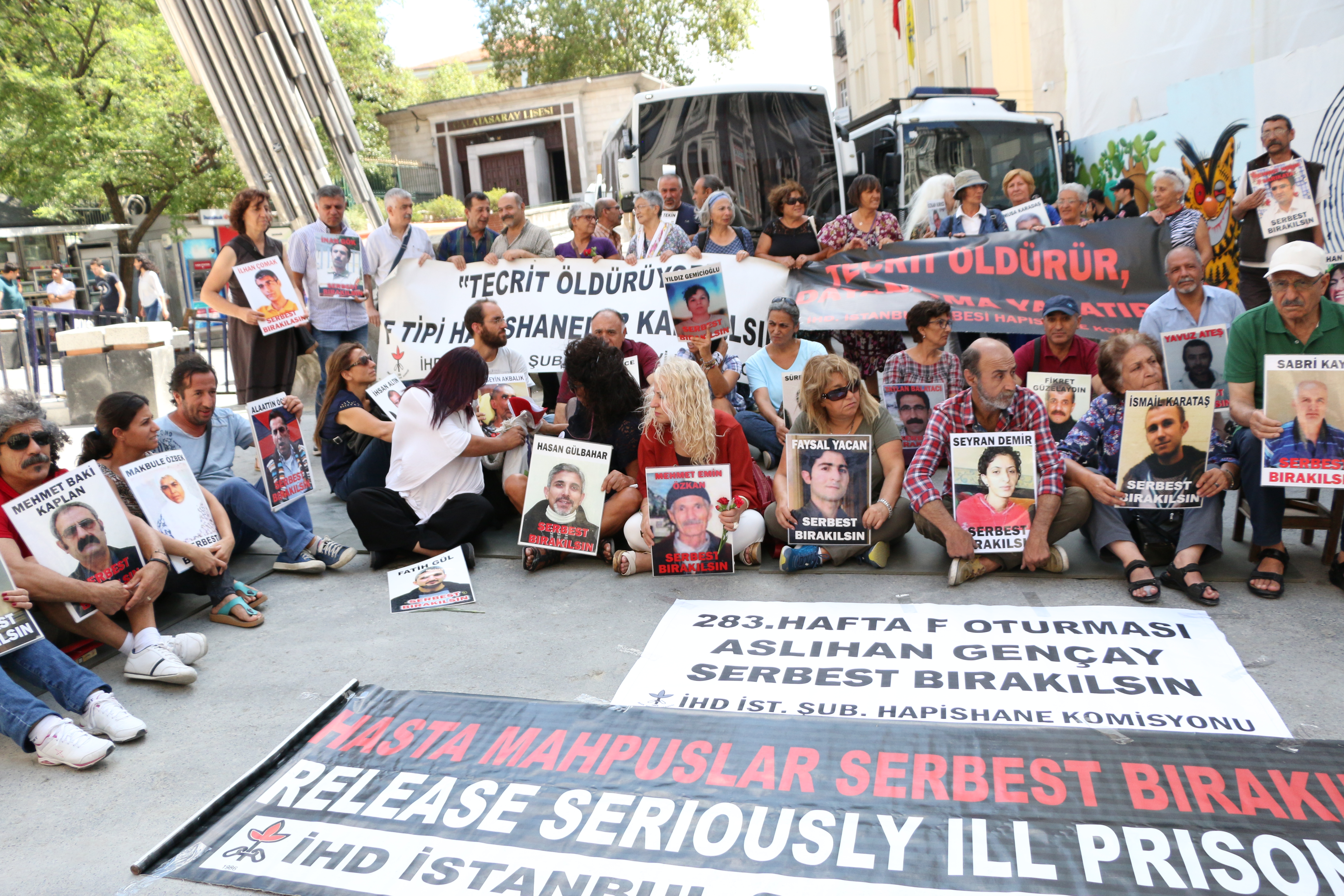 İnsan Hakları Deneği (İHD) İstanbul Şubesi Hapishane Komisyonu her hafta Cumartesi günleri hasta tutukluların durumlarına dikkat çekmek amacıyla Galatasaray Meydanı’nda oturma eylemi yapıyor. Bu hafta 283’üncüsü yapılan eylemde ölüm orucundan dolayı Wernicke-Korsakoff hastalığına yakalanan Aslıhan Gençay’ın serbest bırakılması talep edildi.