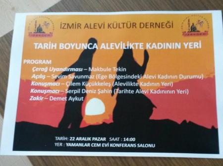İzmir Alevi Kültür Derneği Yamanlar Cemevi kadın kolları ‘Tarih boyunca Alevi kadının yeri’ paneli gerçekleştirecek. 22 Aralık Pazar günü saat: 14.00’da yapılacak panele çerağ uyandırmak için Makbule Tekin, Ege Bölgesindeki Alevi Kadının Durumu’nu Sevim Savunmaz, Alevilikte Kadının Yeri konusunu Çilem Küçükkeleş, Tarihte Alevi kadının yerini ise Serpil Deniz Şahin anlatacak. Yamanlar Cemevi konferans Salonu’nda yapılacak panelde zakir Demet Aykut olacak.