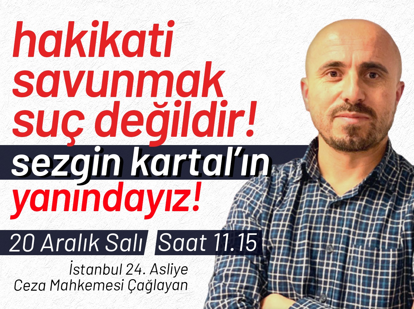 Gazeteci Sezgin Kartal’a açılan davanın karar duruşması20 Aralık Salı, aaat 11.15’te Çağlayan 24. Asliye Ceza Mahkemesi’nde görülecek.