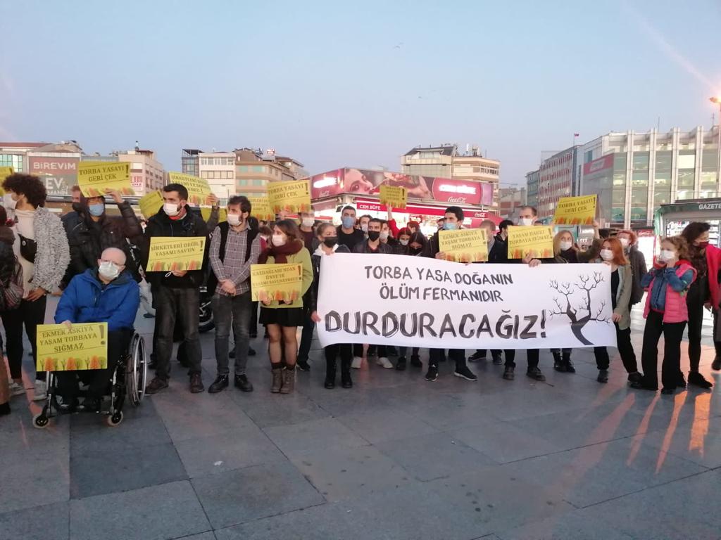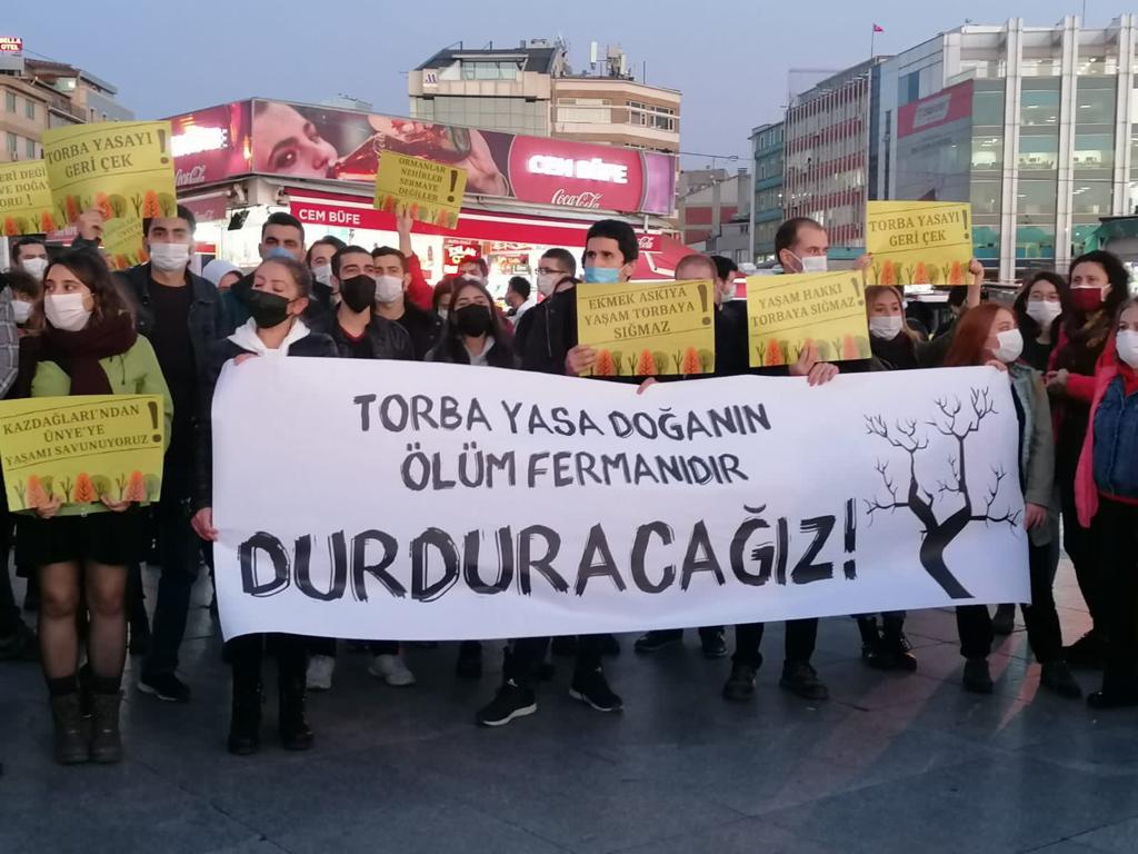 Melis Akyürek’in okuduğu açıklamada, “Torba’da kamusal hiçbir yarar yoktur, doğanın daha fazla hasar alarak belki de geri dönülmez biçimde bozulmasına yol açacağı da kesindir. Halk yoksulluk içinde açlıkla, sellerle, depremle, salgınla baş etmeye çalışırken, iktidar toplumun kaynaklarını sermayeye aktarmanın yeni yollarını aramaktadır. Yıllardır ormanları, dereleri, kıyıları, tarım alanlarını, ve bölgelerimizi yani tüm doğal ve kültürel varlıklarımızı talan eden AKP bu hamlesiyle adeta bu yıkımın üzerine tüy dikmeyi planlamaktadır. Bugün ülkenin pek çok yerinde halk sokaktadır, “rant ve sermayenin çıkarları uğruna doğayı tahrip edemezsiniz” çığlıkları her yerden yükseliyor. Biz yaşamı savunanlar işçiler, emekçiler, kadınlar, gençler, kentliler ve köylüler “yeter artık” diyoruz. Bu talanı durdurmaya kararlıyız, Torba Yasa’yı geri çekin. Yaşam alanlarımızın yok edilmesine izin vermeyeceğiz” denildi.