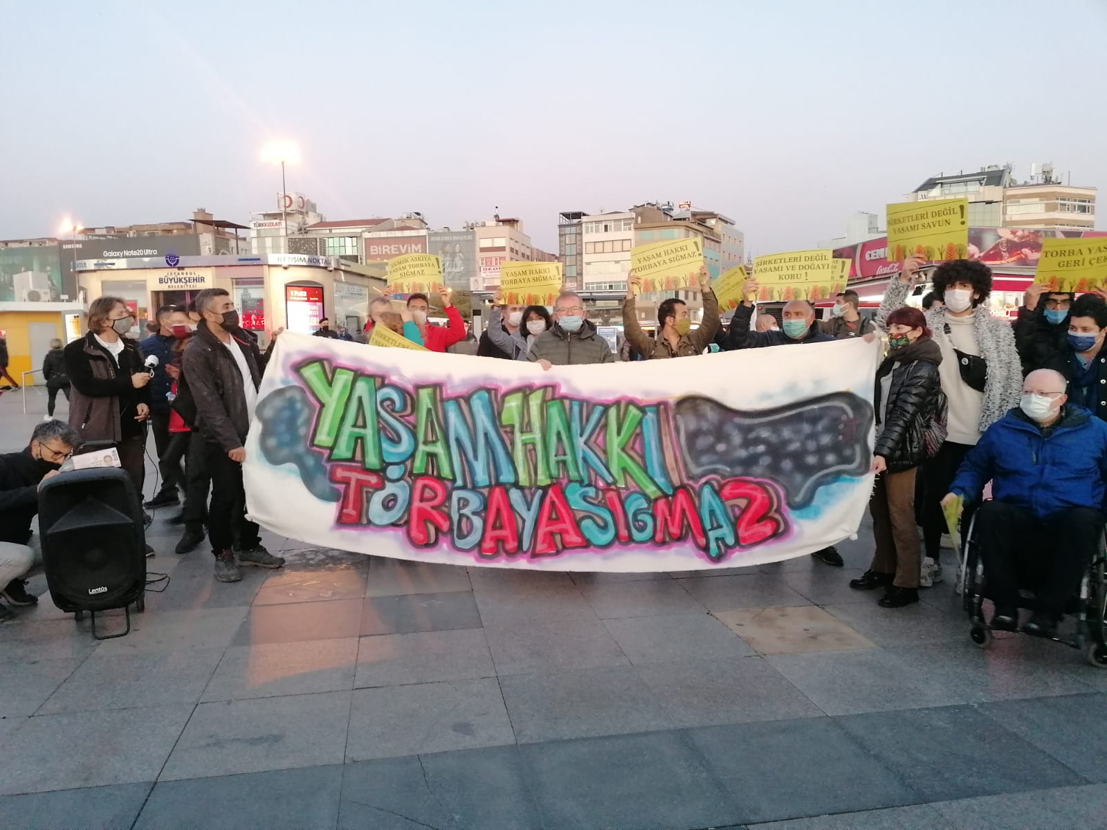 Kadıköy’deki Eminönü İskelesi önünde, “Yaşam hakkı torbaya sığmaz”, “Torba yasa doğanın ölüm fermanıdır, durduracağız” yazılı pankartlar açıldı, torba yasaya karşı dövizler taşındı. Ressamlar da tuval üzerine doğa resimleri çizdi, ayrıca her bir tuvale de “torba yasaya karşı çık” yazdı.