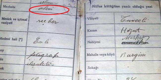 Alevilik nasıl tanımlanmalı ya da tanımlanması gerekiyor mu? Alevi inancının kökeni nedir? gibi sorular hala Alevi camiasında tartışılan konular. Bu sorunlar ekseninde Alevilerin kimlik sorunu da ayrı bir tartışma konusu. Bu çerçevede yapılan tartışmalardan biri de Cumhuriyet döneminden kısa bir süre önce ve sonrasında nüfus cüzdanlarında mezhep kısmına yazılan Alevi ibaresi. Kimisi bunu devletin kimlik kabulü olarak değerlendirirken, kimisi ise devletin asimilasyon politikalarının bir parçası olarak görüyor. Hatırlarsanız Dersim’in Hozat ilçesinde 1938 Dersim Katliamı’nda askerler tarafından öldürülen Alevi dedesi Turabi Baran’a ait bir nüfus cüzdanı ortaya çıkmış, cüzdanda mezhep kısmına Alevi yazıldığı görülmüştü.