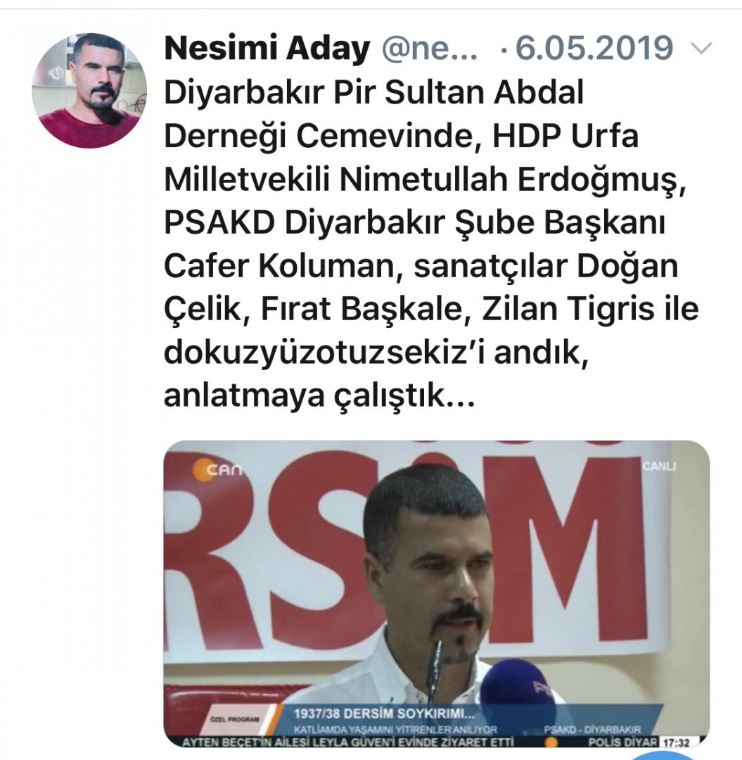 HDP Parti Meclisi, Halklar ve İnançlar Komisyonu üyesi de olan yazar Nesimi Aday’ın, 6 Mayıs 2019 tarihinde, Diyarbakır Cemevin’de yaptığı “Dersim Katliamı” konulu konuşmasının haberini paylaşması ihbara neden oldu. Aday’ın sosyal medya hesabından paylaştığı “Diyarbakır Pir Sultan Abdal Derneği Cemevinde, HDP Urfa Milletvekili Nimetullah Erdoğmuş, PSAKD Diyarbakır Şube Başkanı Cafer Koluman, sanatçılar Doğan Çelik, Fırat Başkale, Zilan Tigris ile dokuzyüzotuzsekiz’i andık, anlatmaya çalıştık” anons haberi de soruşturma gerekçesi yapıldı.
