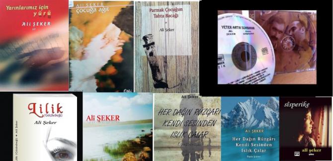 Dilin tılsımının ve tarihinin saklı olduğu annesini kayda alamadığını belirterek, “Mesela benim annem çok lorik (hikaye) söylerdi. Annemin ölümünden sonra kendi kendime çok kızdım çünkü kayda alamamıştım” diye hayıflanıyor Ali Şeker. Makale ve şiirlerinde toplumsal olayları, acıları, sevinçleri ve doğayı işleyen Ali Şeker 8 şiir kitabı ve bir de ‘Yeter Artık Sonbahar’ isimli şiir ve türkü ortak albüm çalışması olmak üzere toplamda 9 eser vermiş.
