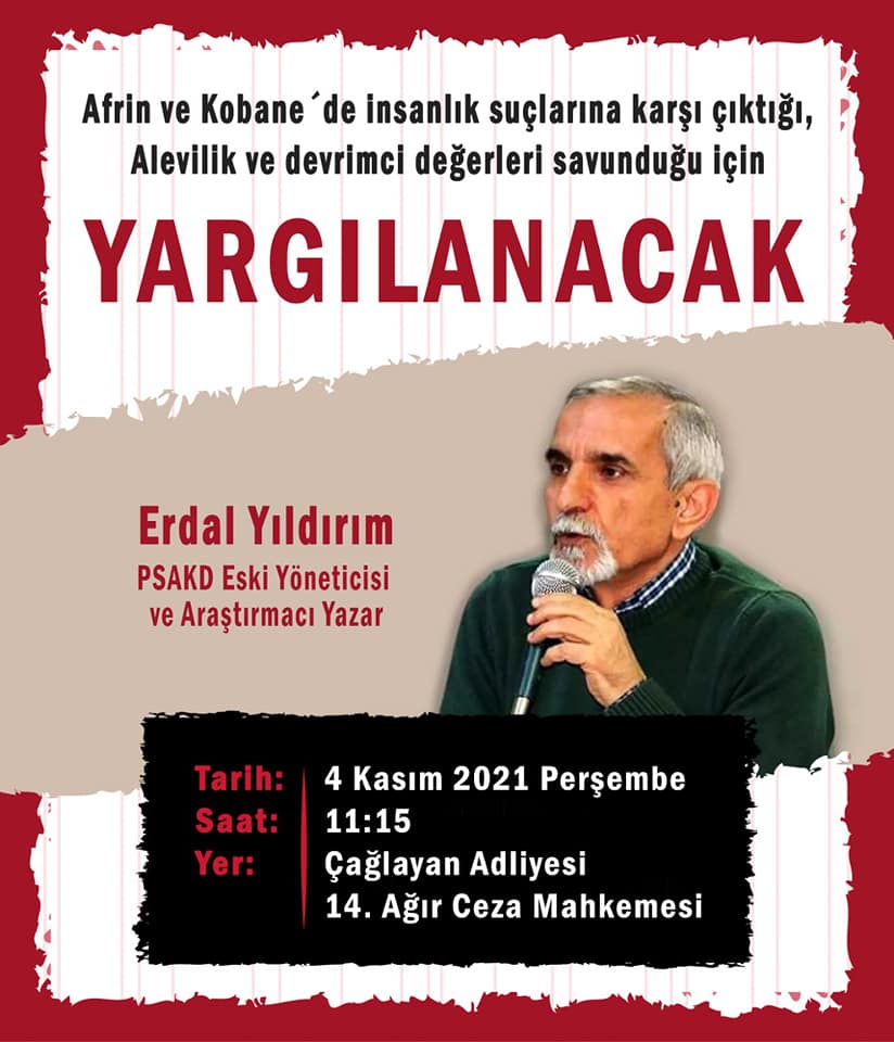 PİRHA- PSAKD eski yöneticisi ve Yazar Erdal Yıldırım 2015-2018 yılları arasında yaptığı sosyal medya paylaşımları gerekçesiyle yargılandığı davanın ikinci duruşması görülecek. Duruşmaya, 4 Kasım Perşembe günü saat 11.15’te Çağlayan Adliyesi’nde İstanbul 14. Ağır Ceza Mahkemesi’nde devam edilecek. Yıldırım’ın, IŞİD’in Suriye’de gerçekleştirdiği katliamları protesto eden paylaşımları dava dosyasında suç olarak nitelendiriliyor.