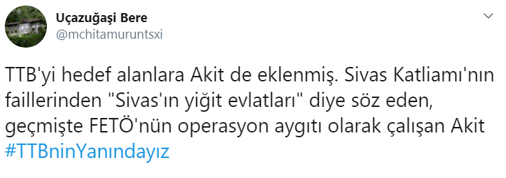 Öte yandan 2 Temmuz Sivas Katliamı davasında gazetenin haberini de hatırlatan Twitter kullanıcısı, Sivas Katliamının faillerinden “Sivas’ın yiğit evlatları” diye söz eden, geçmişte FETÖ’nün operasyon aygıtı olarak çalışan Akit Gazetesine karşı TTB’nin yanındayız” diyerek tepki gösterdi.