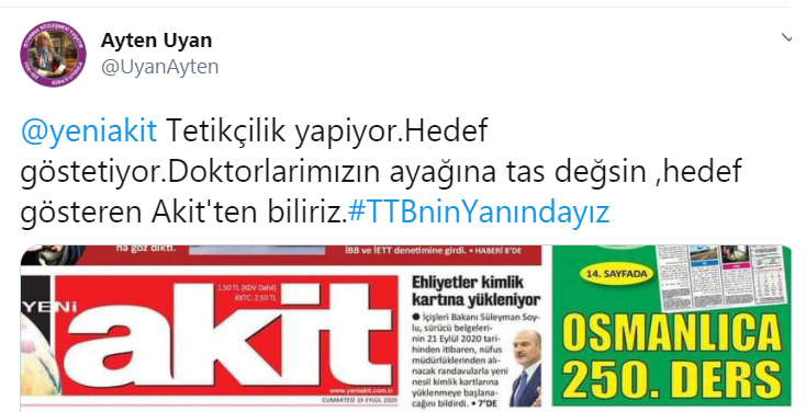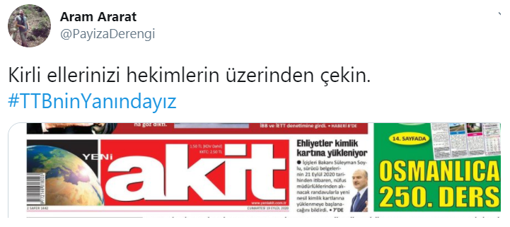 PİRHA-Yeni Akit Gazetesi, Türk Tabipler Birliğini (TTB) hedef gösterdi. TTB yönetimini hedef gösteren Akit Gazetesine sosyal medya kullanıcılarından tepki geldi. Twitter kullanıcıları “TTB’yi hedef alanlara Akit de eklenmiş. Sivas Katliamı’nın faillerinden “Sivas’ın yiğit evlatları” diye söz eden, geçmişte FETÖ’nün operasyon aygıtı olarak çalışan Akit Gazetesine karşı TTB’nin yanındayız”, “Kirli ellerinizi hekimlerin üzerinden çekin” diyerek tepki gösterdi.
