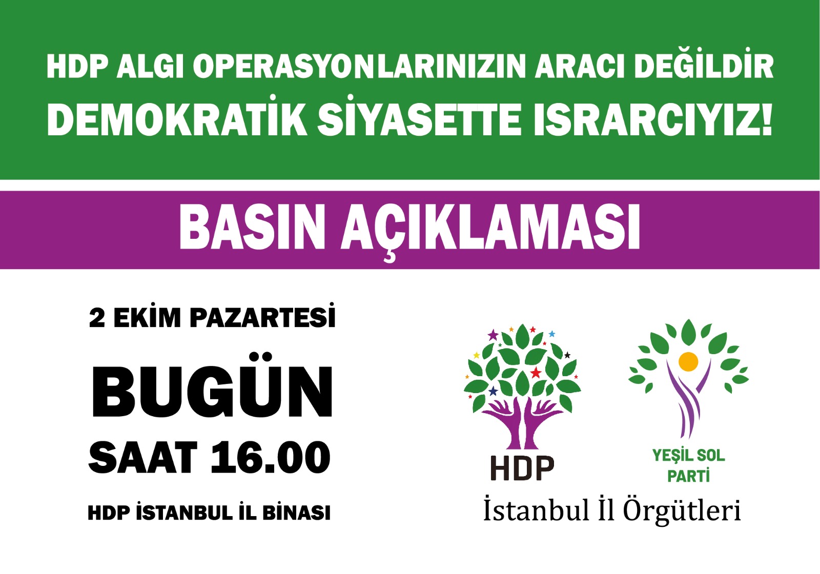 Siyasetçi ve sivil toplum örgütü temsilcilerine dönük gözaltı operasyonu, bugün HDP İstanbul İl Örgütü binası önünde protesto edilecek. HDP’nin sosyal medya hesabından yapılan açıklamaya göre, bugün saat 16.00’da HDP İstanbul İl Başkanlığı önünde yaşanan gözaltılara karşı bir basın açıklaması yapılacağı ifade edildi. Basın açıklamasına milletvekillerinin de katılması bekleniyor.