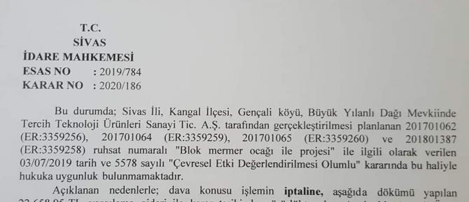 Mahkeme tarafından Yılanlı Dağı’nda mermer çıkartılmasına imkan veren ‘ÇED Olumlu Kararı’ iptal edildi. Verilen kararda, “Sivas İli Kangal Gençali Köyü Büyük Yılanlı Dağı mevkinde Tercih Teknolojileri Ürünleri Sanayi Tic. Aş tarafından gerçekleştirilmesi planlanan ‘Blak Mermer Ocağı Projesi’ ile olarak ilgili olarak verilen 03.07.2019 tarih ve 5578 sayılı ‘Çevresel etki Değerlendirmesi Olumlu’ kararından bu haliyle hukuka uygunluk bulunmamaktadır. Bu nedenle işlemin iptaline….”