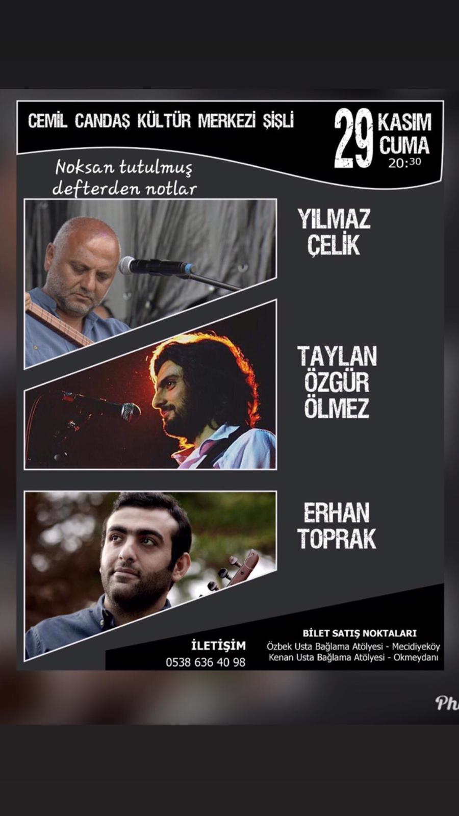 Sanatçı Yılmaz Çelik, Erhan Toprak ve Taylan Özgür ‘Noksan Tutulmuş Defterden Notlar’ şiarı ile 29 Kasım Cuma günü saat 20:30’da Şişli Cemil Candaş Kültür Merkezi’nde konser verip sevenleri ile buluşacak.