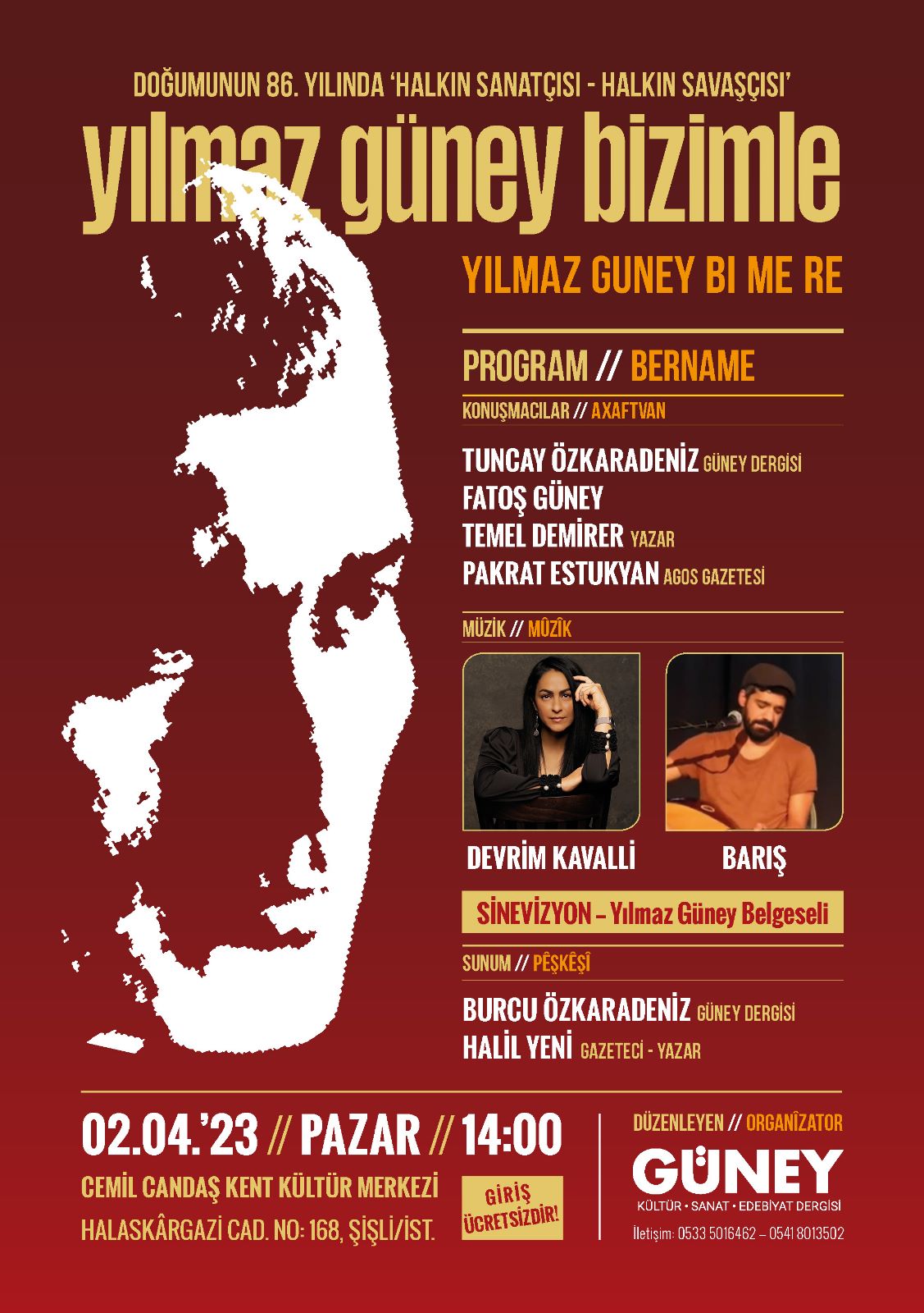 Sanatçılar Devrim Kavallı ile Barış da etkinlikte yer alacak diğer isimler olacak. Program kapsamında Yılmaz Güney belgesel gösterimi yapılacak. Etkinliğin sunuculuğunu ise Güney dergisinden Burcu Özkaradeniz ve Gazeteci Yazar Halil Yeni üstlenecek.