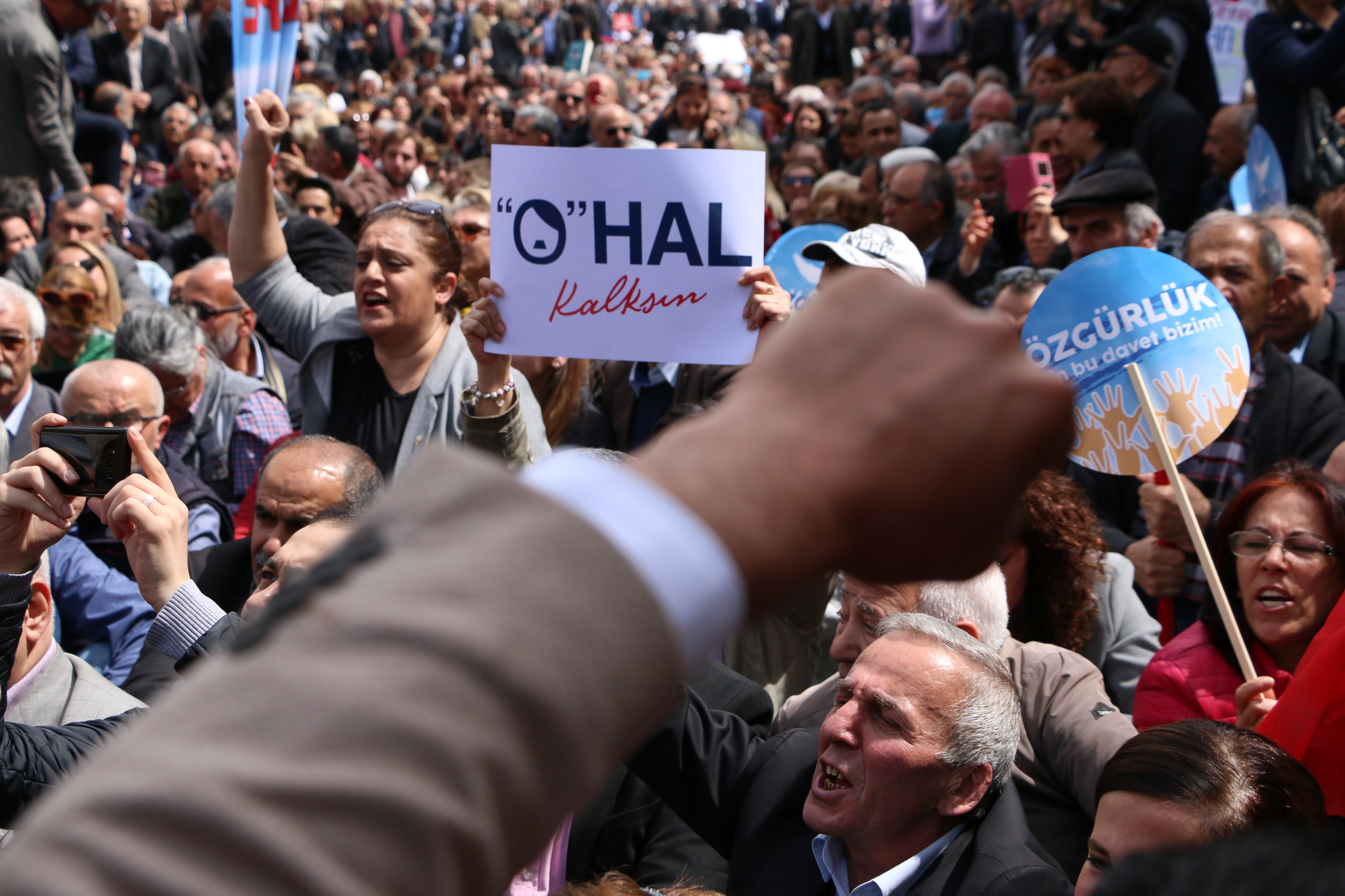 Türkiye’nin OHAL şartları altında Kanun Hükmünde Kararname’lerle değil toplumu temsil eden parlamentoyla yönetilmesini istediklerini vurgulayan başka bir kadın yurttaş da “Hukukun üstünlüğünün, parlamentonun üstünlüğünün tekrar sağlanması, seçtiğimiz vekilleri görevini yapmasını sağlamak için burada ‘Hak, hukuk, adalet’ diyoruz. OHAL değil demokrasi diyoruz, demokrasimizi geri istemek için oturuyoruz.” şeklinde konuştu.