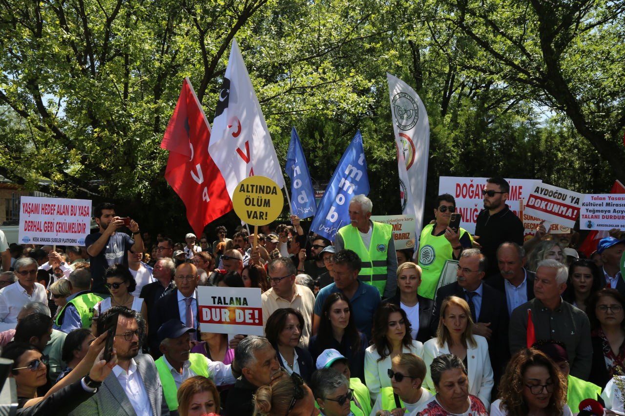 Çeşitli kentlerinden Ankara’ya gelen çevre savunucuları, meslek örgütleri, demokratik kitle örgütleri, milletvekilleri ve çok sayıda yurttaş zeytinlik alanlarda madencilik yapılmasına yönelik kanun teklifinin Meclis Komisyonu’ndan geçmesini protesto etmek için Türkiye Büyük Millet Meclisi (TBMM) Dikmek Kapısında bir araya gelerek eylem yaptı.