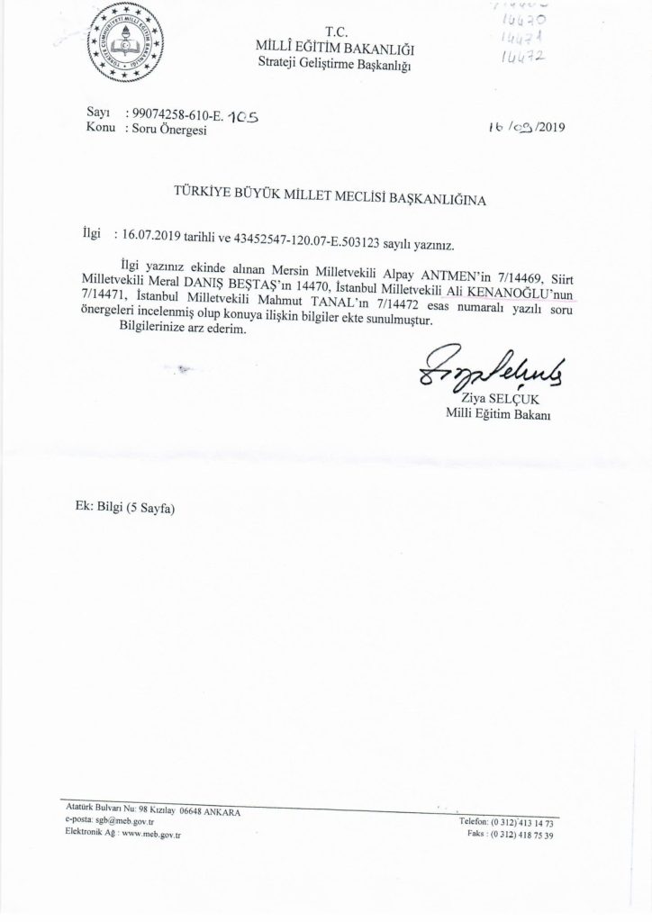 Milli Eğitim Bakanı Ziya Selçuk’tan, Haziran ayında verilen soru önergesine yanıt geldi.