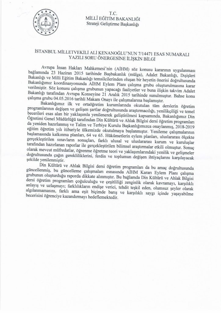 Kenanoğlu, hem soru önergesinde hem de basın toplantısında, AİHM’in 2007 ve 2014 yılında aldığı kararlarla, Din Kültürü ve Ahlak Bilgisi dersinin zorunlu derslerden çıkarılması yönünde iç hukuktaki gerekli düzenlemelerin AİHM kararları ışığında bir an önce yapılması yönündeki kararını ilettiğini belirtmiş ve bu konuda gerekli iç düzenlemelerin derhal yapılması yönündeki talebi dile getirmişti.